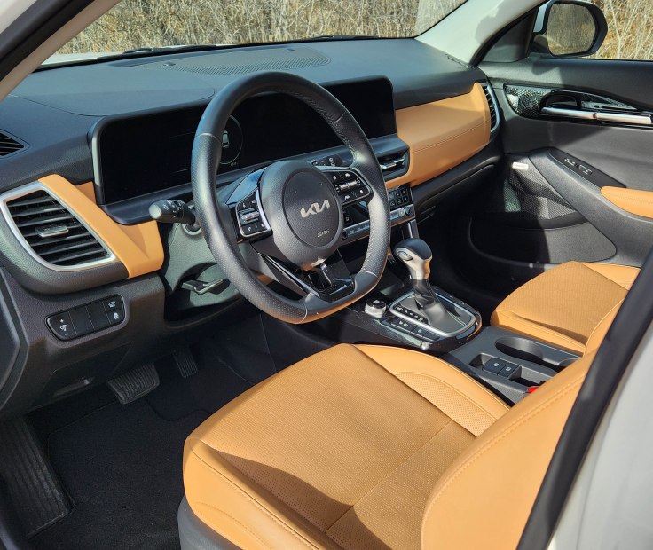 The dash is a matte black top with tan lower trim as the leather-like seats also are that handsome tan. A gloss black trim brightens the door panels and satin chrome trim is used there and on various vents and controls. Smartly the cupholder area is flat black too, so Seltos avoids any major reflections to distract the driver on sunny days.