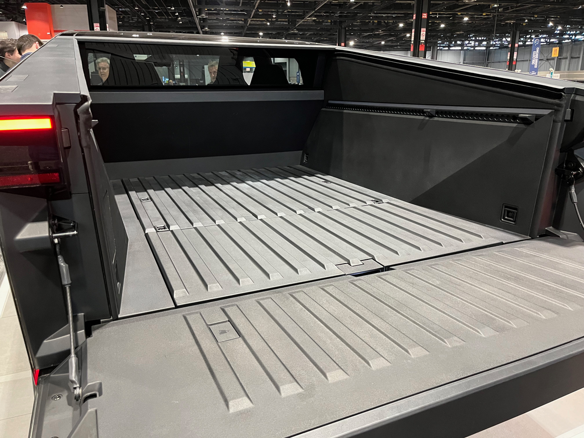 Tesla hasn’t officially revealed the Cybertruck’s battery sizes, but I found some data from the EPA and, while I’m not a math wiz, calculated an estimate 122.4-kWh. When hooked up to a Supercharger, the company says the AWD model can add 136 miles in 15 minutes. The electric truck’s driving range varies with the number of motors, but Tesla estimates AWD versions can travel 340 miles per charge, and the Cyberbeast, seen here at The Chicago Auto Show, will go 320 miles. Those claims rise to over 440 and 470 miles, respectively, with an optional range extender battery pack that fits inside the truck’s cargo bed. The RWD Cybertruck has an estimated 250 miles of range. I’m guessing real-world testing might reveal lower numbers, especially when towing a large trailer in cold weather. How much does the Cyberbeast weigh? 6,843 pounds! Yikes!