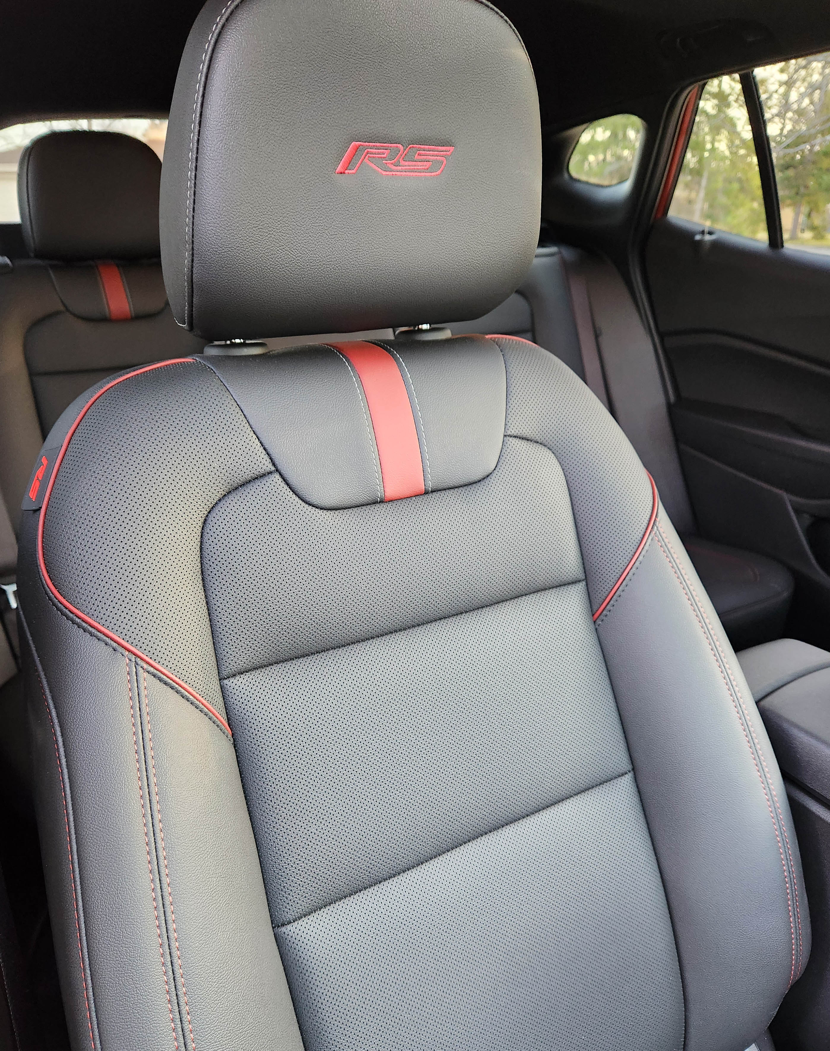 This being an RS model the seat backs have red/orange RS embroidered there and stitching in the fake leather seats is orange to match the exterior while there’s a reddish stripe across the dash and the outer round air vents feature a sort of red sunburst pattern that makes them stand out. Other redish-orange accents help enliven the look too.
