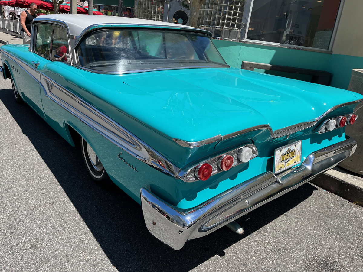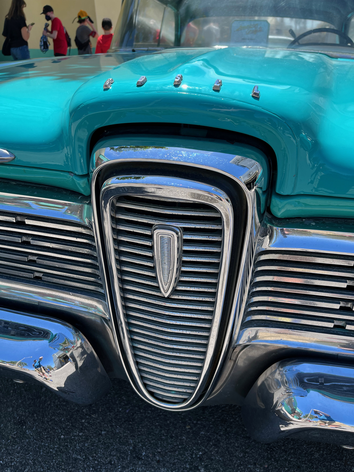 But the car stood out, at least at first, with its unique horseshoe grill. This 58 I spotted on a recent trip to Orlando, FL, and Universal Studios was famous for being one of the cars used in the 1973 film American Grafitti. This model is the longer base Corsair trim one of seven models offered in the first year. There were four sedans and three station wagons. The lower-trim Ranger and Pacer shared bodies with the 118-inch wheelbase Fairlane sedans, while the higher-trim Corsair and Citation shared bodies with the 124-inch wheelbase Monterey and Mercury Montclair sedans. The two wagons, the two-door Edsel Roundup and the four-door Edsel Villager and Edsel Bermuda shared its body and 116-inch wheelbase with Ford station wagons. Yes, a two-door wagon!