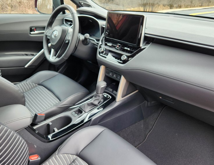 Remember this is a Corolla, as in it’s based on the Corolla chassis with similar dimensions. It’s not a luxury crossover and certainly is no rocket. But it’s efficient and comfortable, and in its two-tone black over Barcelona Red Metallic paint scheme ($500 extra) looked sporty.