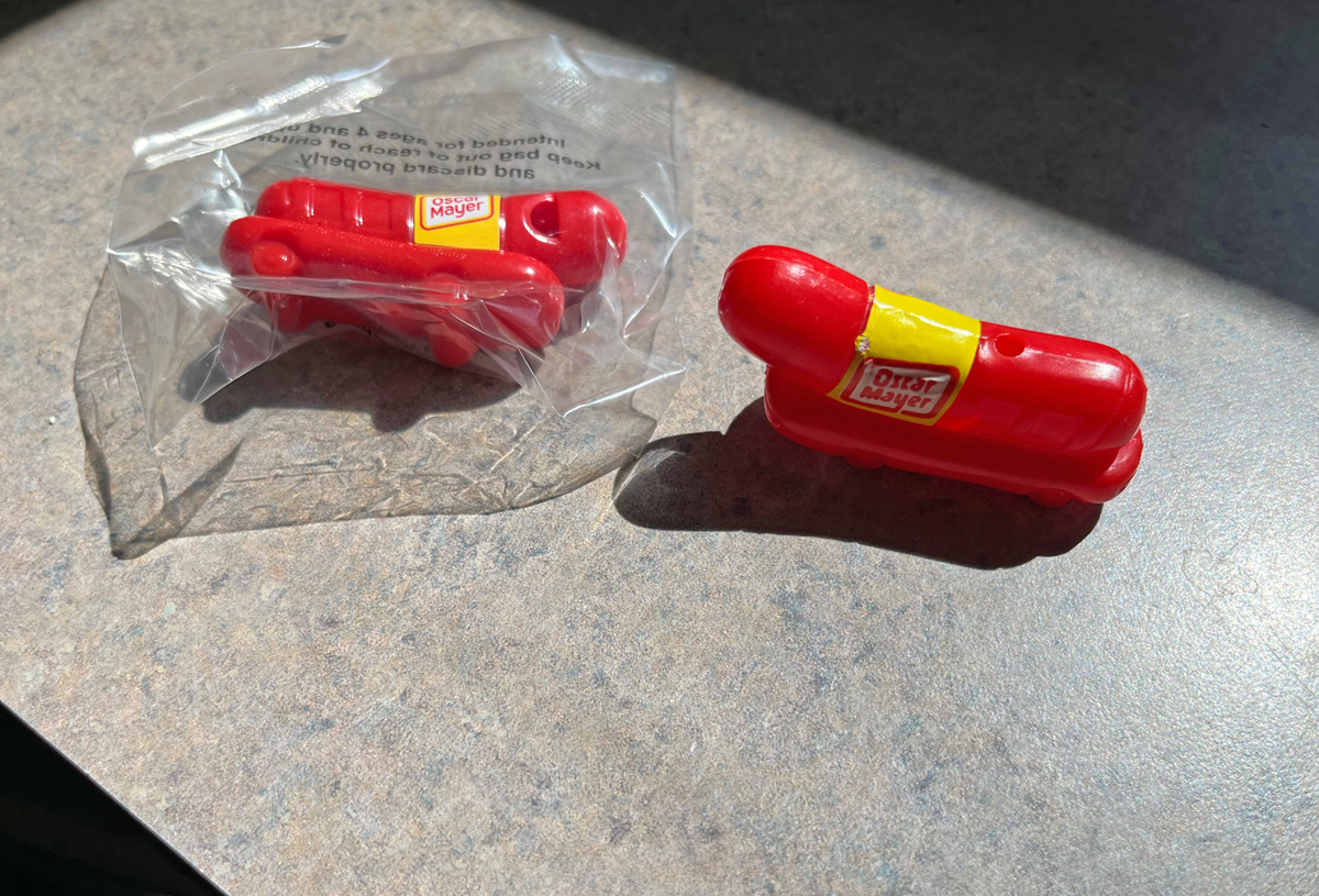 I got excited one time when our daughter Meg sent me a link to a site where you could apply to drive one of the six Wienermobiles for the summer, but dog gone it, you have to be a college-age kid and I’m a bit past that. One cool thing they did at this recent stop was hand out whistles which we snagged. And then I found out wife Ann has an original one from 40 years ago. FUN, FUN, FUN!