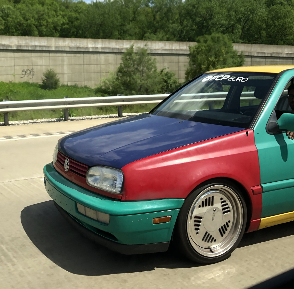 Deciding to test the idea in the U.S., the company exhibited four prototype Golfs at North American auto shows in 1996. It went over so well that Golf Harlequins were built at VWās Puebla, Mexico plant, where the cars were painted a single color and then body panels were removed and redistributed among other vehicles, with no color bordering itself on an adjacent panel. The unibody elements on this example are, the front fenders and grille are Tornado Red, the front bumper cover, front doors are Pistachio Green, rear quarter is Ginster Yellow, and the hatch and hood are Chagall Blue. Ah but the concept bombed here with less than 300 sold. The cars sat on dealer lots and many of them were changed back to one color.
