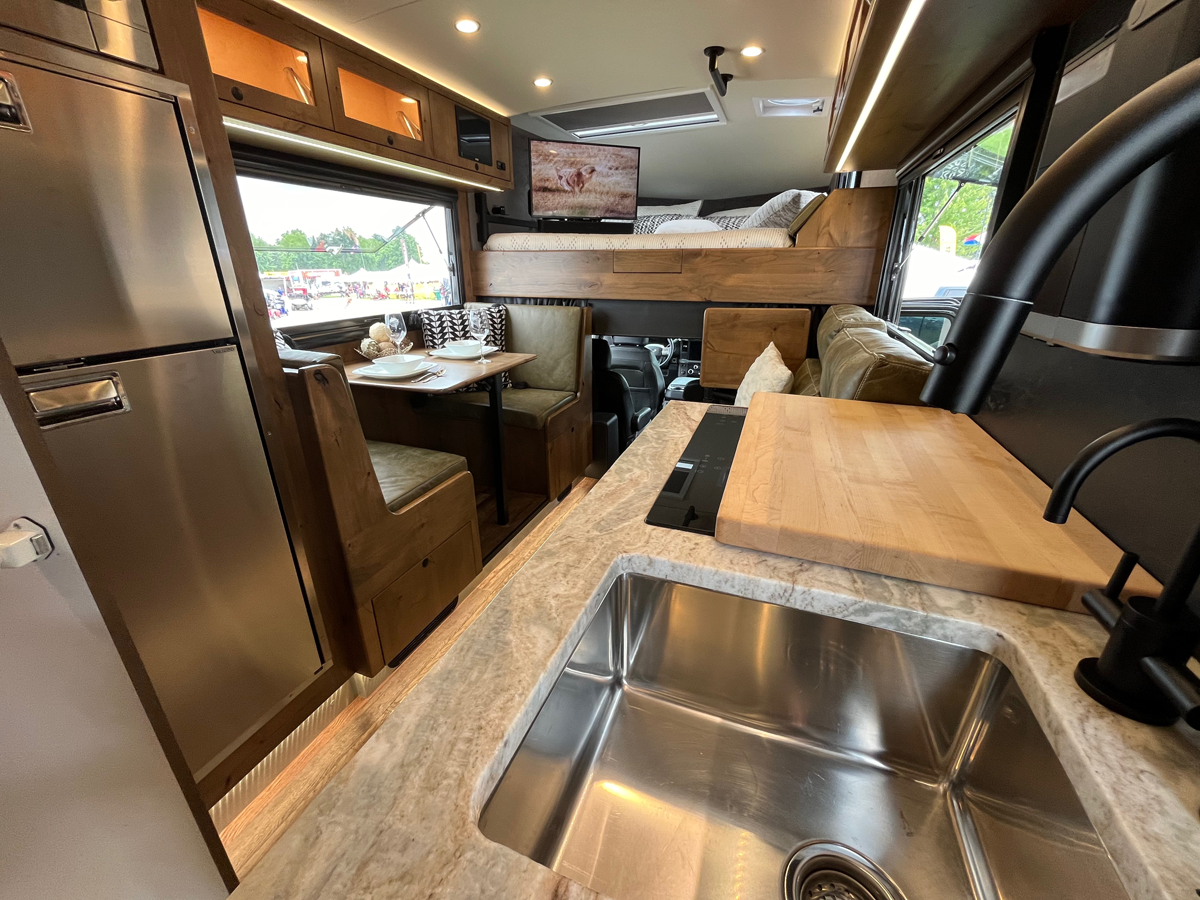 According to its website, EarthRoamer’s mission is to create the world’s most innovative and capable, go-anywhere, luxury, off-grid vehicles that enable owners to explore their world in total comfort and with complete confidence. Wow, that’s an understatement. Built on a Ford F-550 Lariat 4WD Chassis and powered by a 6.7L Turbo Diesel, while its carbon fiber body is a work of art in new technology. Each LTi body is crafted through a Vacuum Infusion Process (VIP), which bonds two carbon fiber skins to a structural foam core, creating a monocoque body giving the vehicle unparalleled strength and lightness compared to traditional RV and overland camper bodies. The EarthRoamer LTi can go anywhere. Riding on Goodyear 43” tires paired with military-grade beadlock rims, it’s home on anything from paved highways to rugged trails and has a top speed of 81 mph. Not bad for a vehicle weighing around 17,000 pounds.