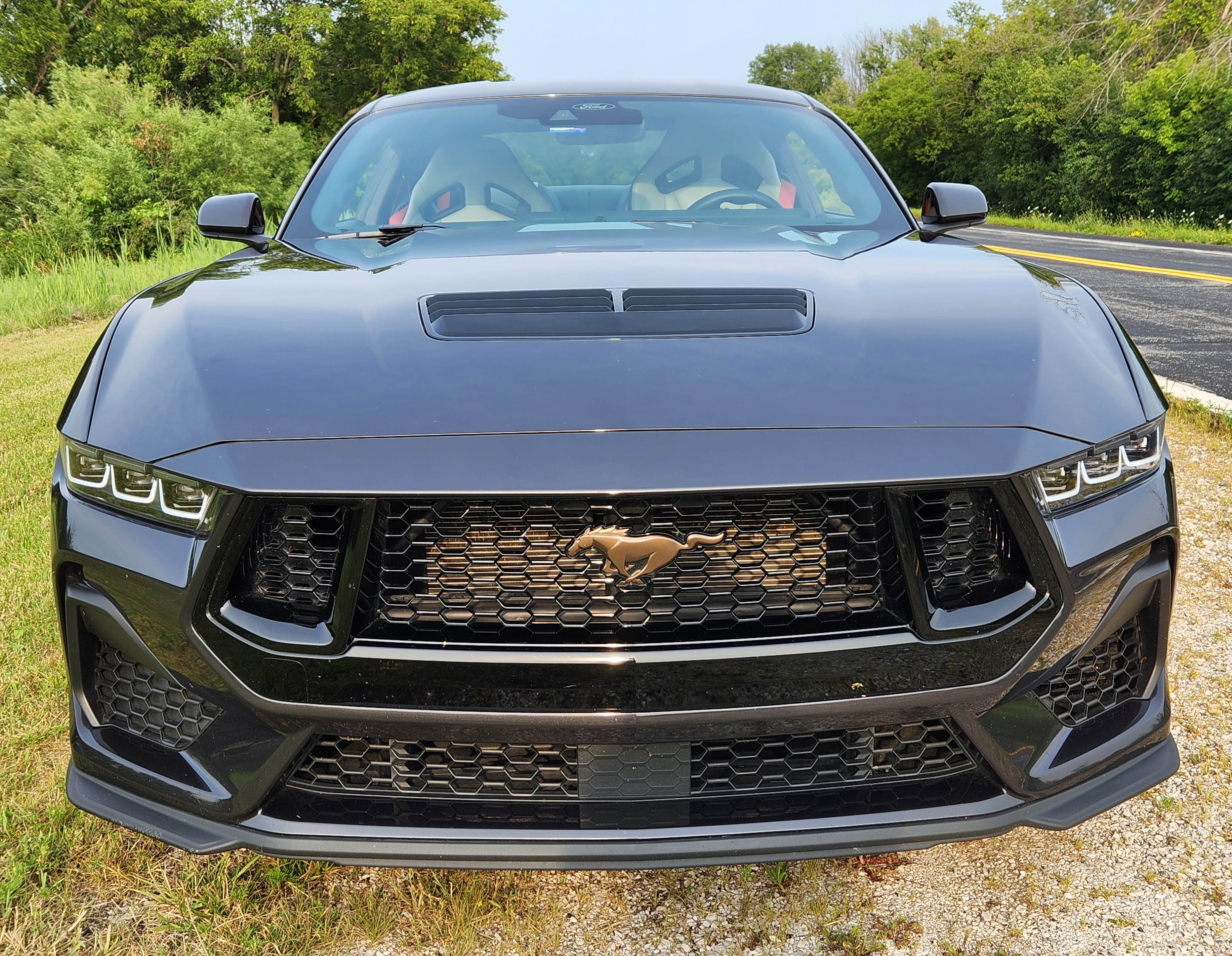 The Dark Matter Gray Metallic test car featured sharp light gray leather seats with black trim and a dash accented with gray stitching and textured gray trim. Door panels include light and dark gray door inserts, and yes, there’s still a pony on the steering wheel hub. Door release pulls are chrome. Oh, and the seatbelts are red, and just $295 extra.