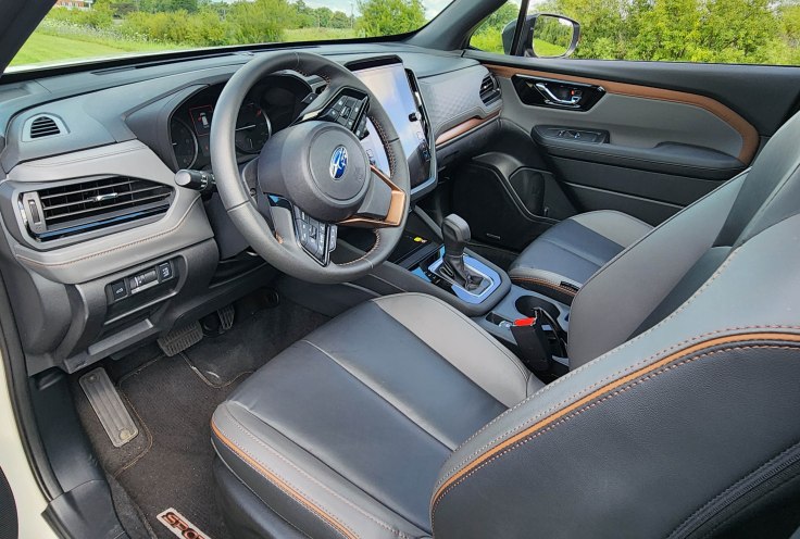 Subaru stiffened the chassis by 10%, reshaped the gray StarTex upholstered seats, and packed in enough sound deadening to dramatically quiet the interior. Bravo!