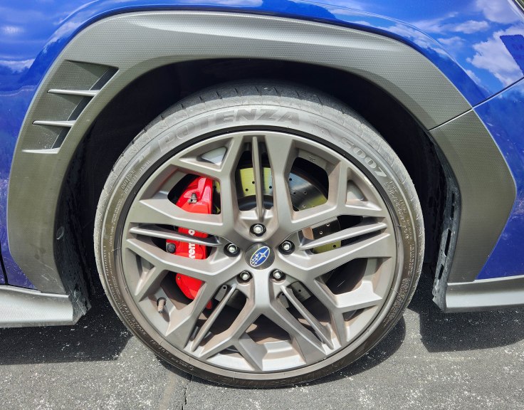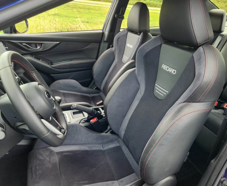Power? Oh my, the juiced up turbo 2.4-liter 4-cylinder boxer engine rips off 271 horsepower and 258 pound-feet of torque. That’s a neck stretcher (0-60 mph in about 5.5 seconds) that pushes a person hard into the beautifully supportive Recaro seats. Rip around a turn and those hug like grandma at Christmas.