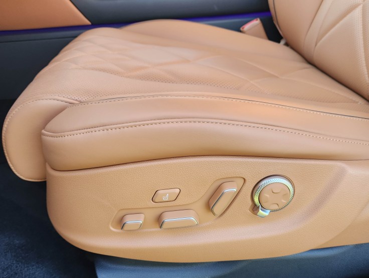 Seats are well shaped and in Sport mode the driver’s side bolsters automatically expand creating more lateral support. A lot of buttons on the seats sides too including one to extend the lower cushion an aid to long-legged drivers. There also are power buttons on the passenger’s inner edge seatback to adjust the seat to improve rear seat leg comfort.