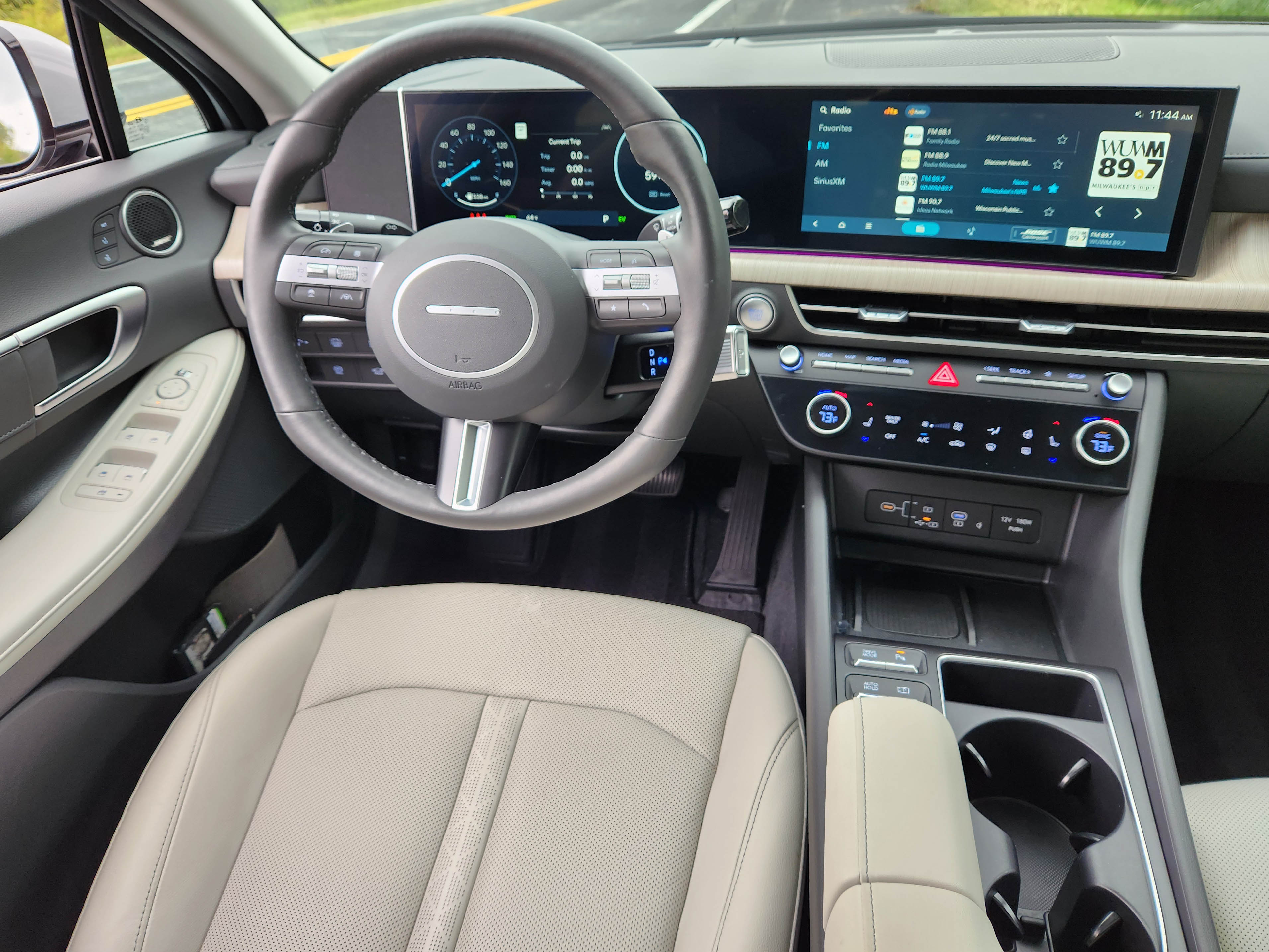 And then there’s the dark gray dash and doors along with white (closer to cream) leather-trimmed seats and armrests. This looks classy, near luxury, especially considering the combined dual flat screens for the driver’s instrument panel and the info screen. Sheesh, the luxury makes have only been offering this dual concept for a couple years and here Hyundai is dishing it in a family car.