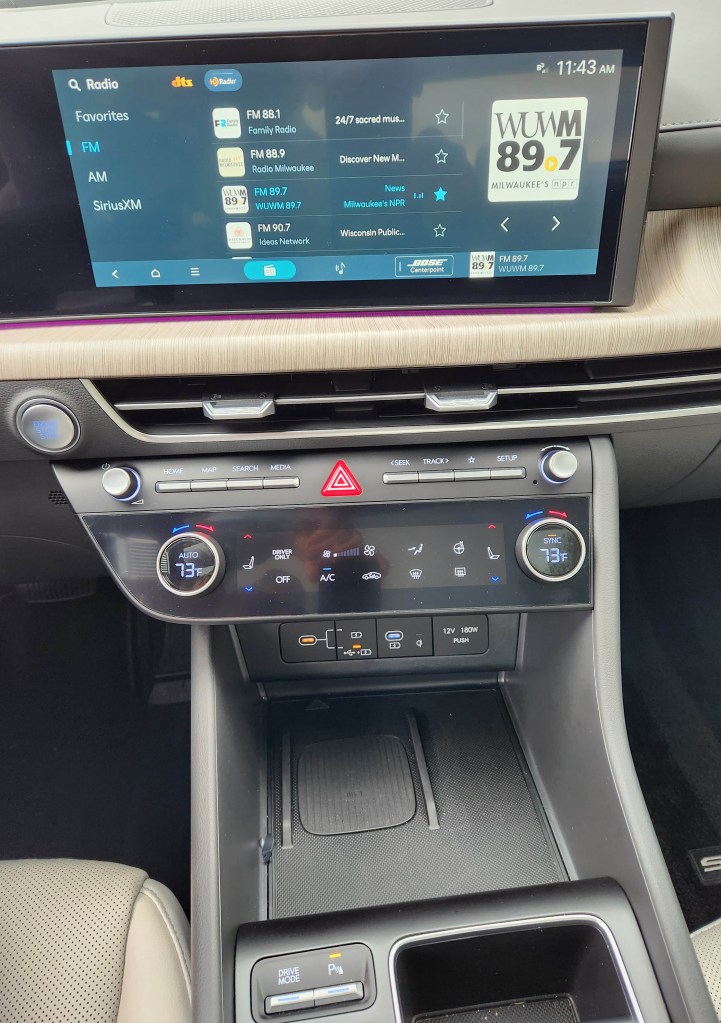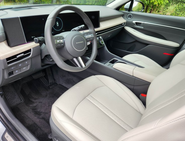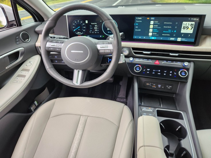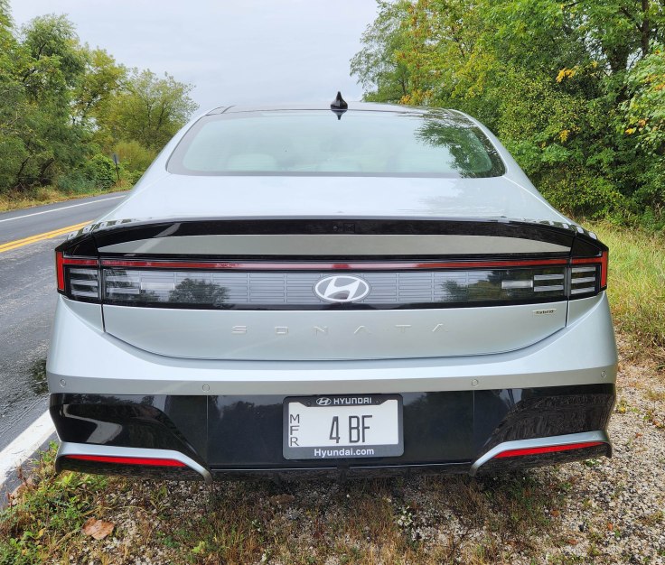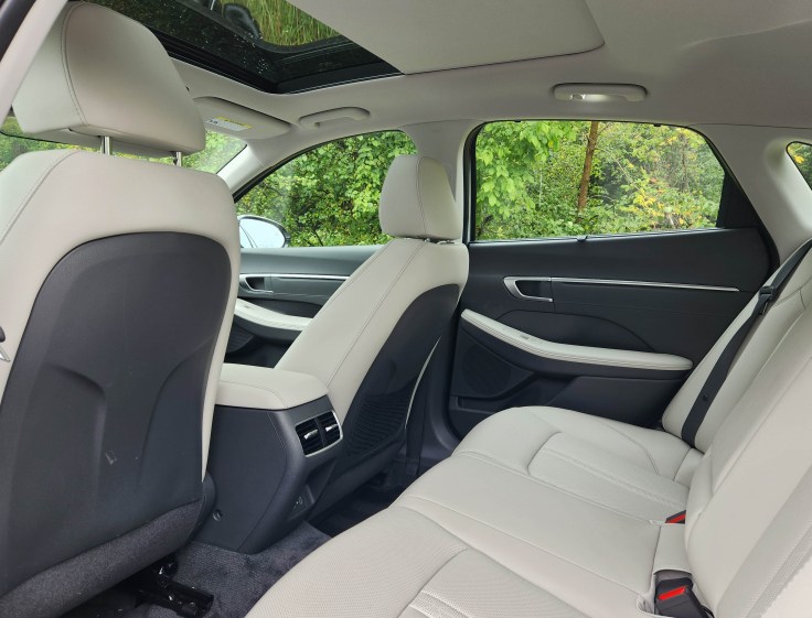 Sonata’s Limited Hybrid is a well-equipped hybrid sedan with a roomy interior, fancy large dual screen instrumentation, a power trunk, wireless phone charger, and heated and cooled front seats. There’s also a Bose premium stereo and a driver’s seat that powers back when the push-button ignition is turned off, and immediately powers forward once the driver has closed the door.