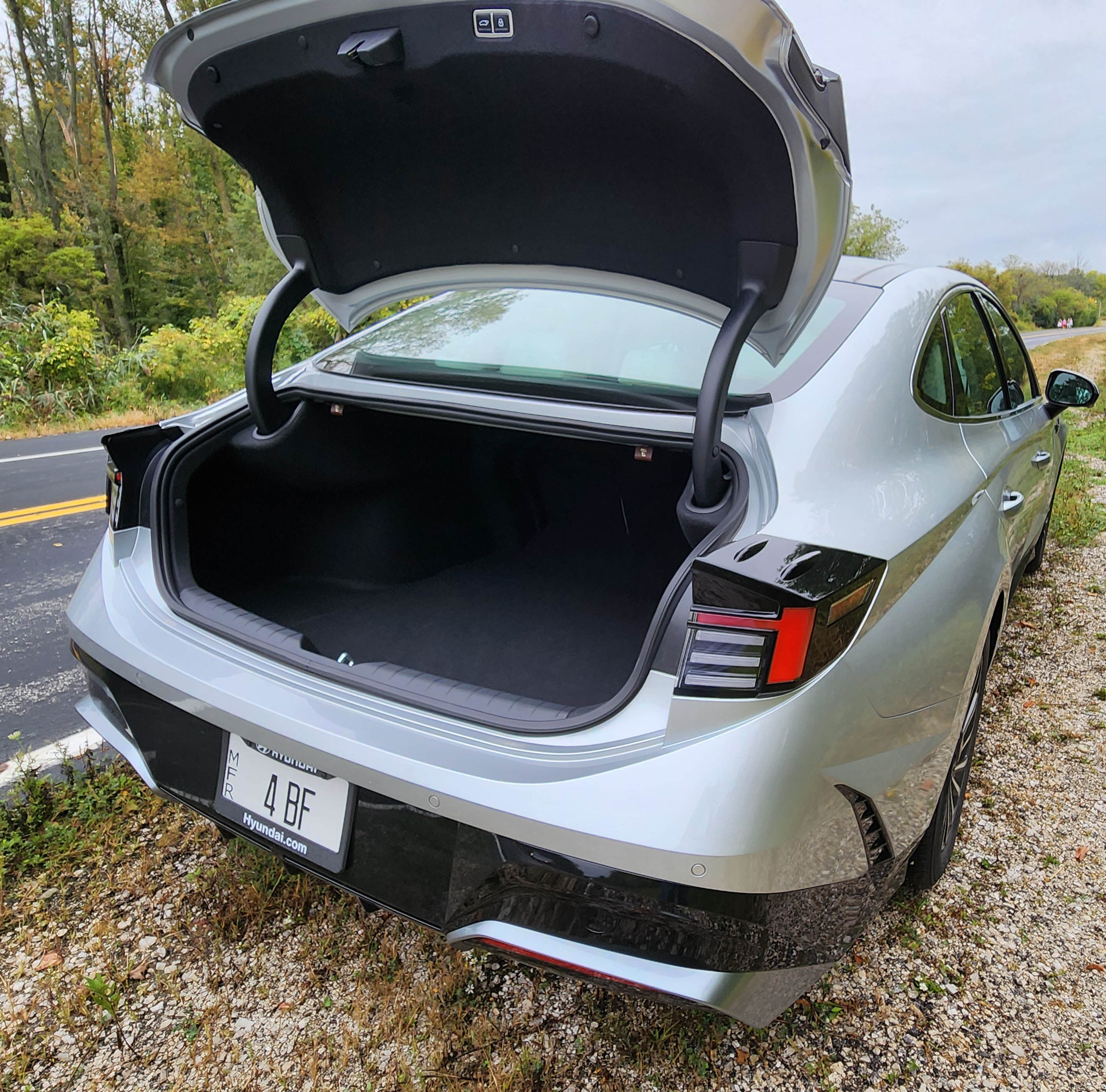 Head and legroom are plentiful front and rear with the back seat including plug-ins for electronics and a fold-down console. Rear seats split and fold flat with the releases being inside the large Sonata trunk with a power release inside and on the trunk lid’s face. There are even manual side window sun shades for the rear seat.