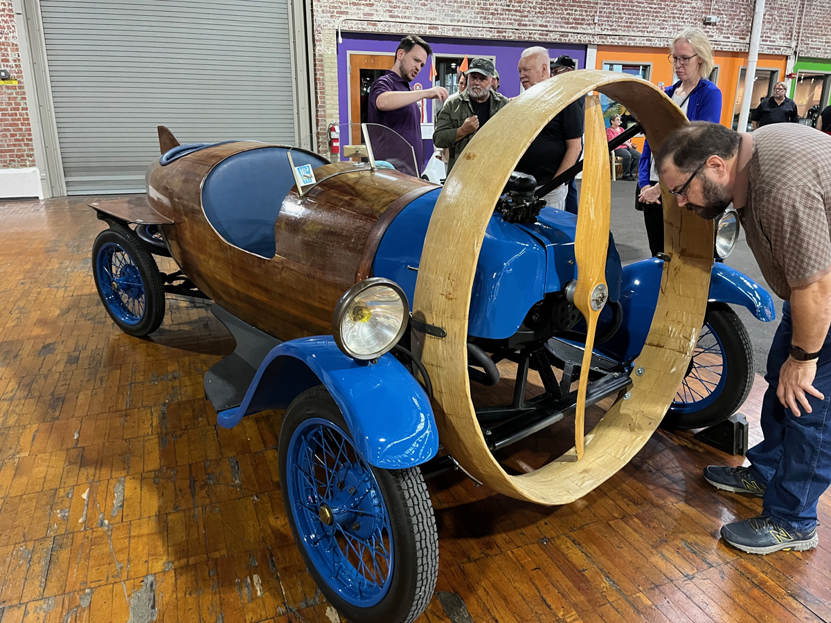 During a noon demonstration at the Lane Motor Museum that I visited in Nashville recently, the curator treated us to more info on the car. It’s fully road-worthy and the museum takes it to shows in the area. What’s it like to drive? Since it uses a propellor for propulsion, it takes a while to accelerate from a standing stop, and going up a hill requires a good head of steam. The chassis was built by renowned French engineer Lucien Rosengart, however, its orientation was backward meaning that the steering wheel of the Helicron turns the rear wheels as opposed to the front. Think of driving a forklift truck but with a box fan strapped to the front. He even started it up and you can see the video here.