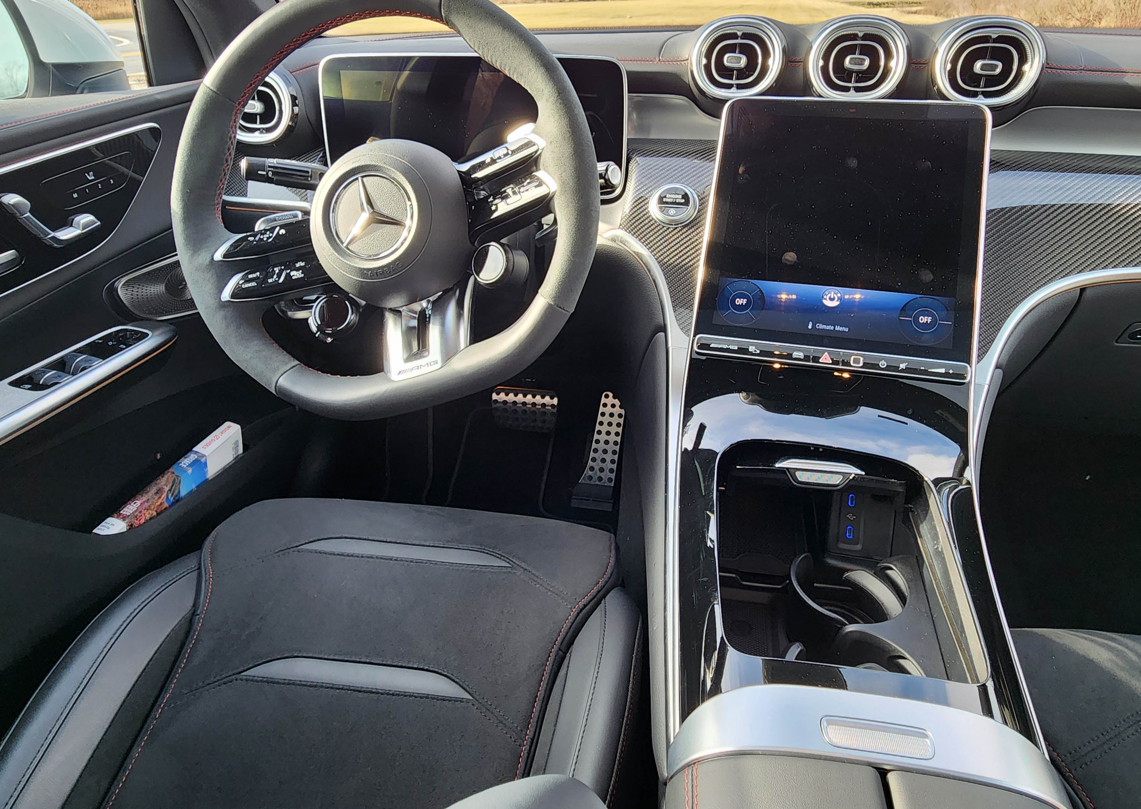 If one likes giant digital screens that dominate the dash, a black gloss console that is extremely reflective, as is the carbon fiber dash trim, and enough buttons and dials to ground a seasoned pilot, well, the GLC 43 is for you.