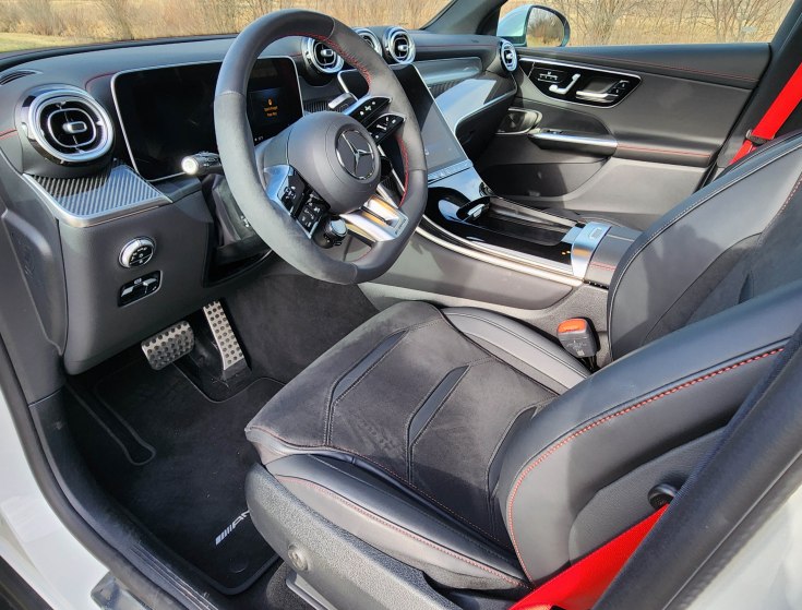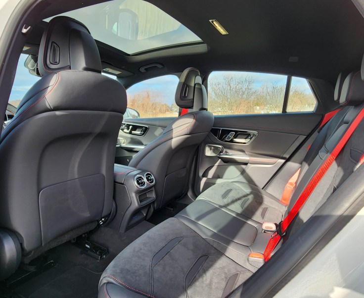 The best news here is the black soft-touch leather/suede seats that are well shaped and supportive, plus powered. They also look sharp with an AMG logo on their headrest. Power controls are on the doors with three memory buttons. Oddly though those controls are rather stiff and hard to adjust, so be sure to do any seat shifting before driving, and lock in your seat setting.