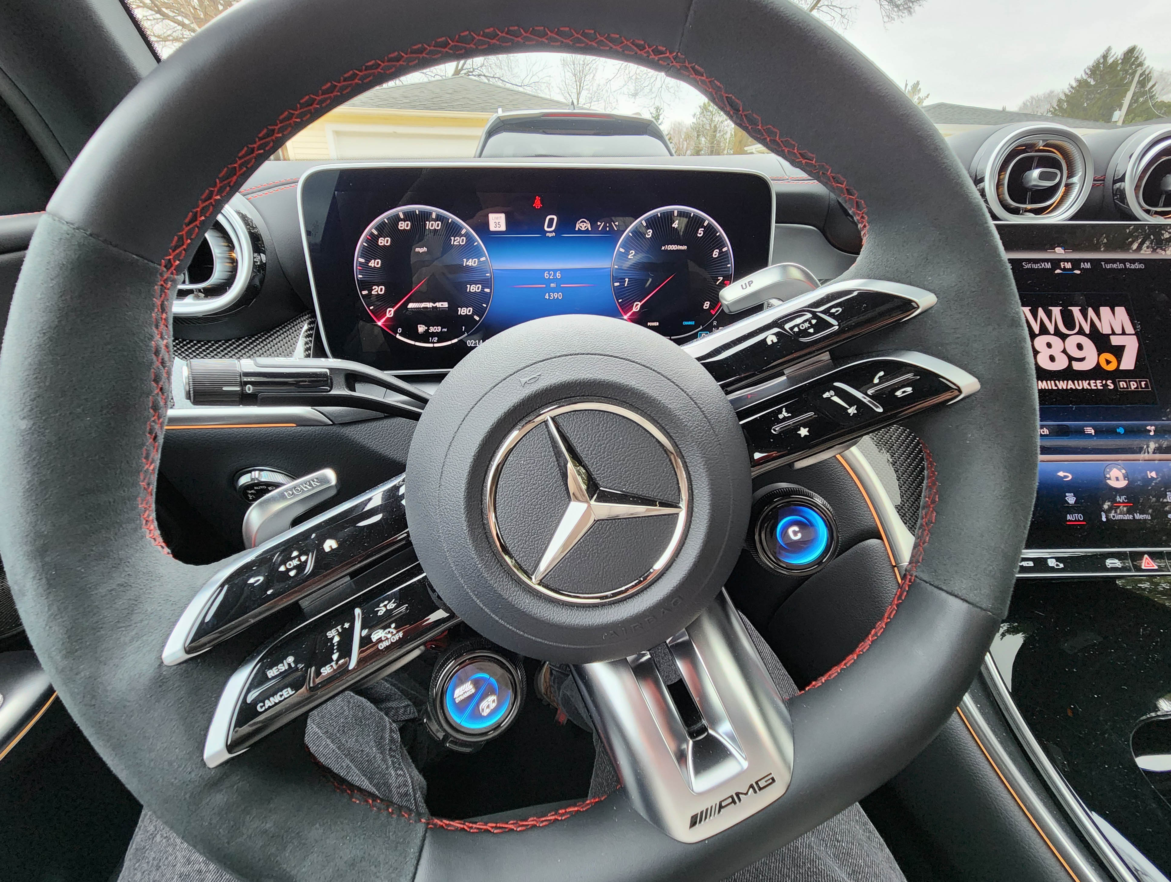 Anyway, there are no less than 21 buttons or haptic slides (one for radio volume) on the steering wheel and of course one can adjust the suspension and exhaust system to meet individual needs. Again, all divert from the driving exercise and one would hope your Mercedes dealer has a 4- to 6-hour class to educate the buyer on all the functionality that normally a race team’s chief mechanic would handle before sending you out on the race track.