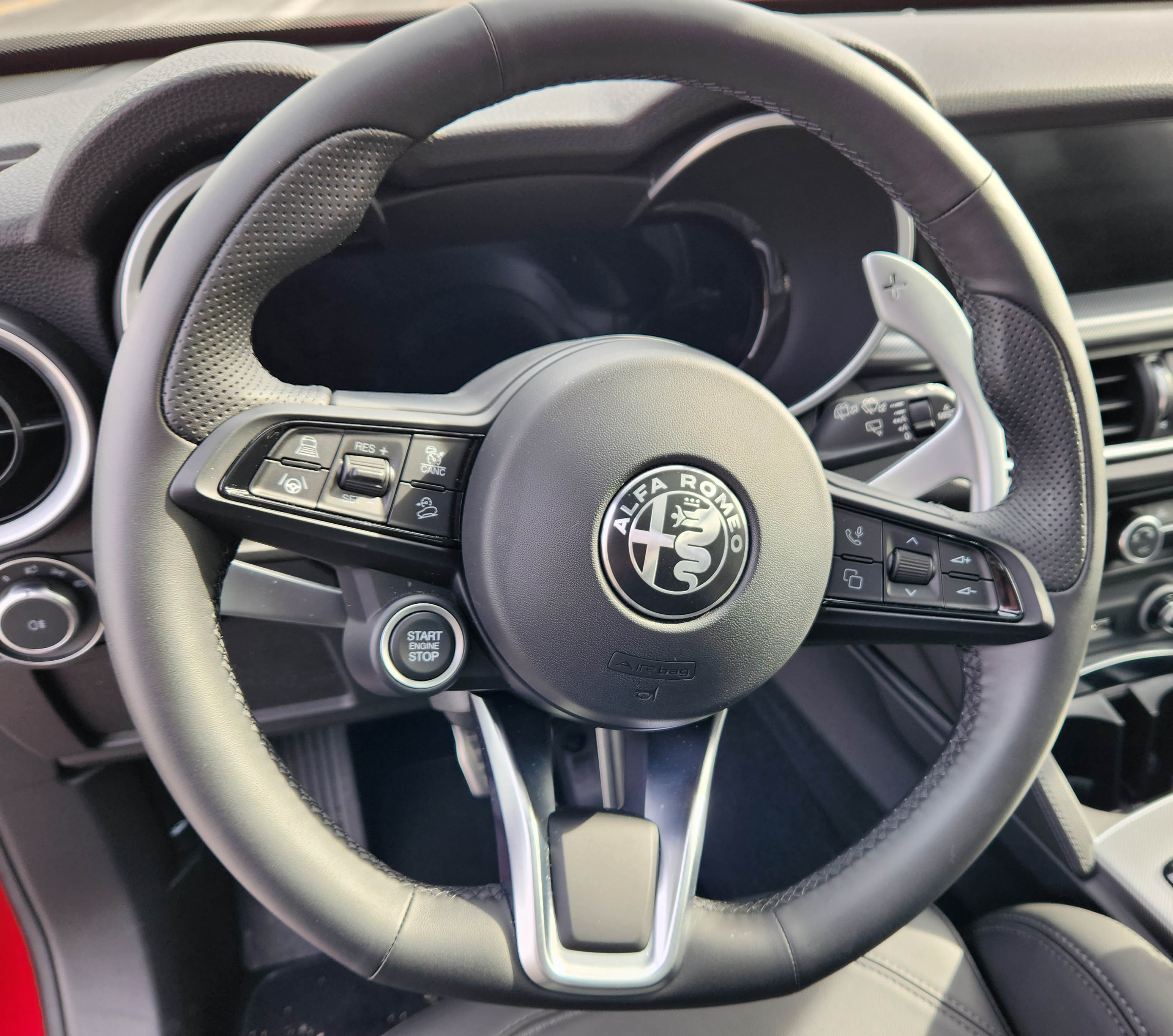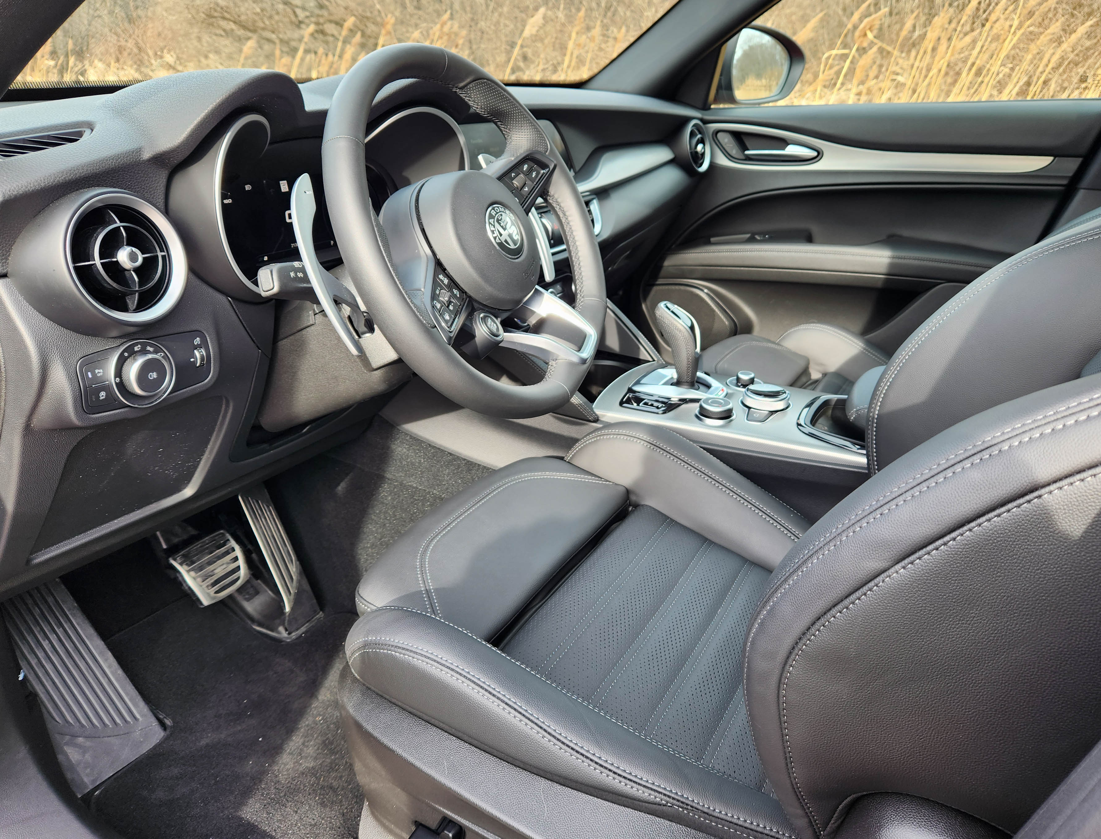 Inside, the Stelvio continues to be stylish with comfy black leather seats, satin chrome trim on air vents and door handles, plus a textured metal dash, console, and door trim. Sharp!