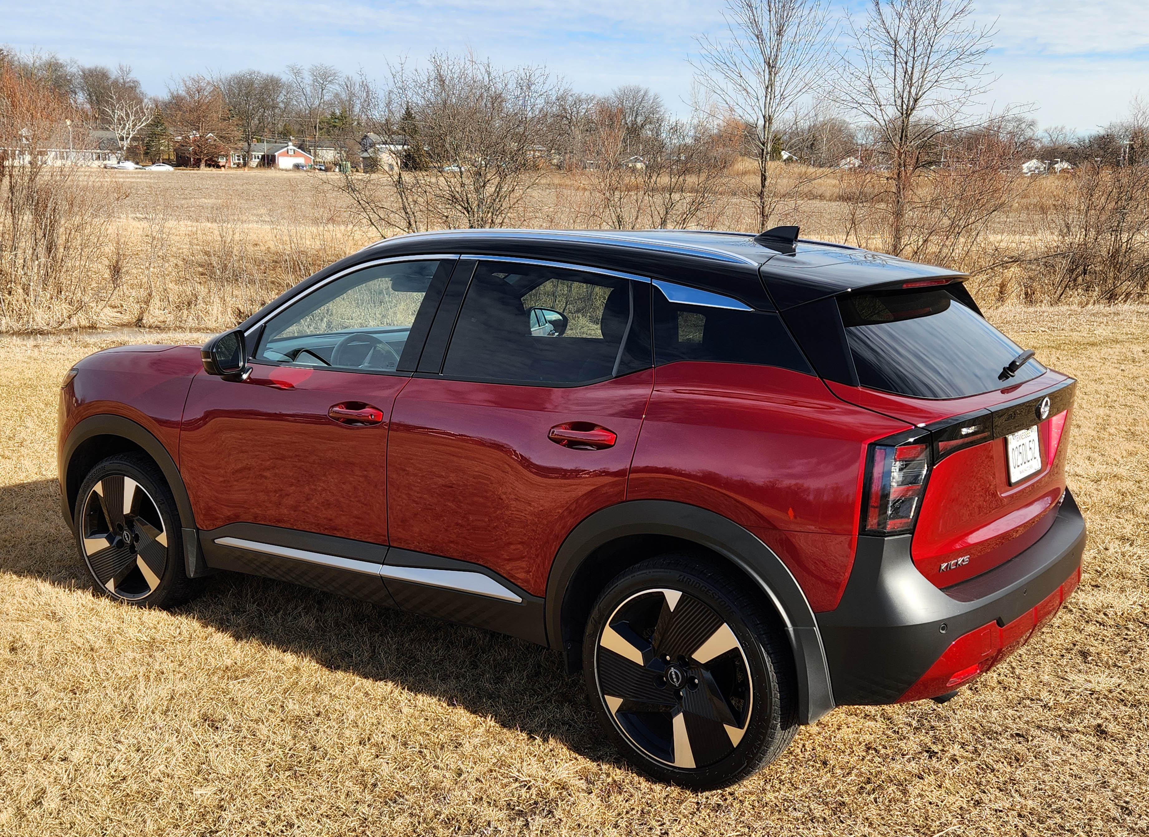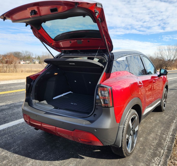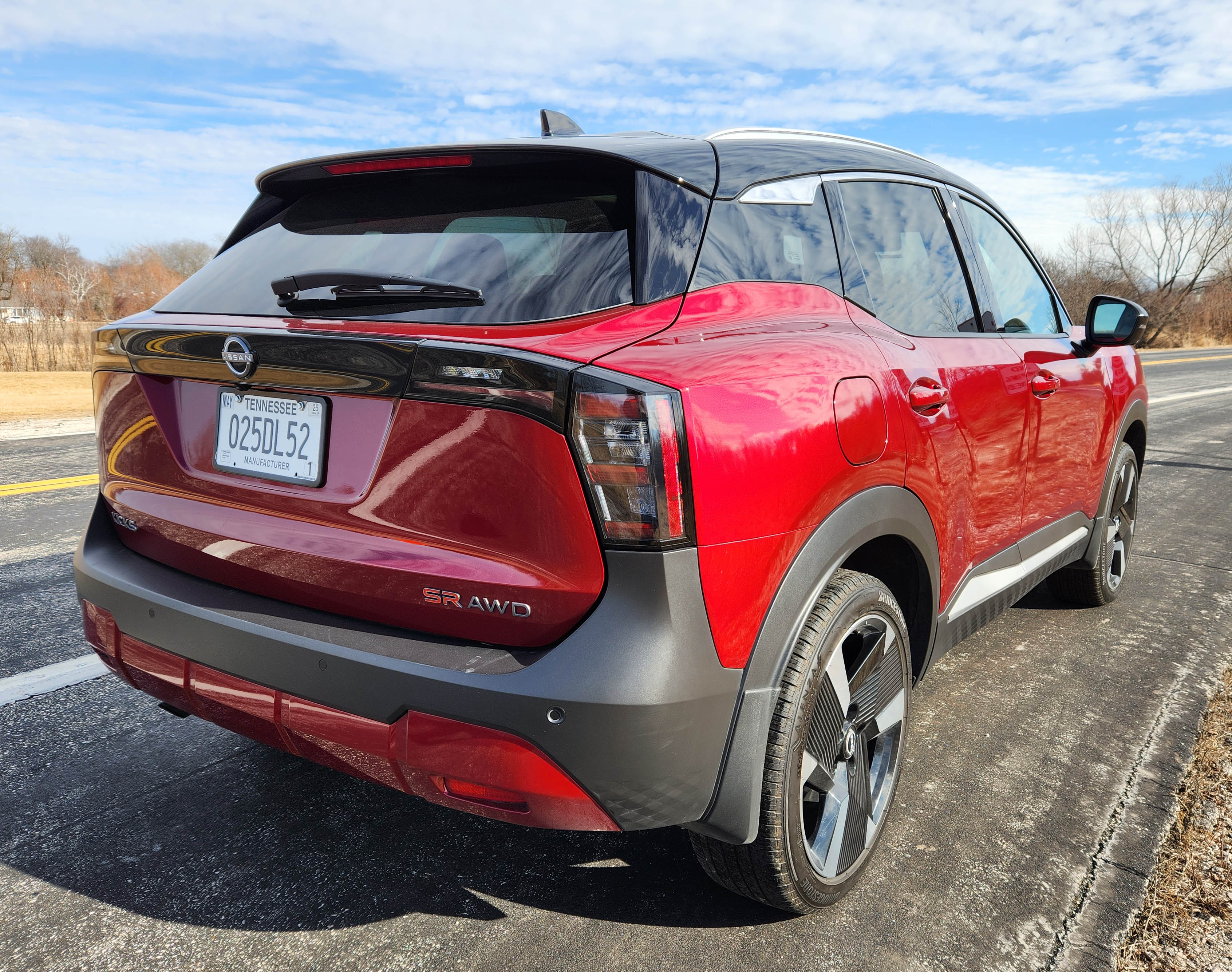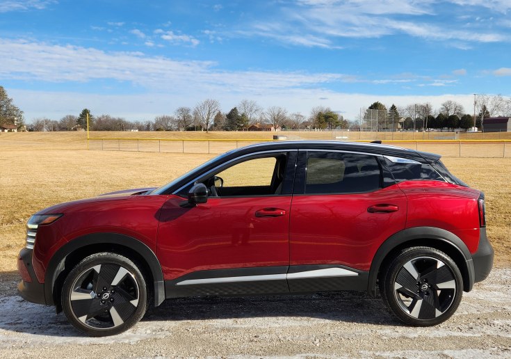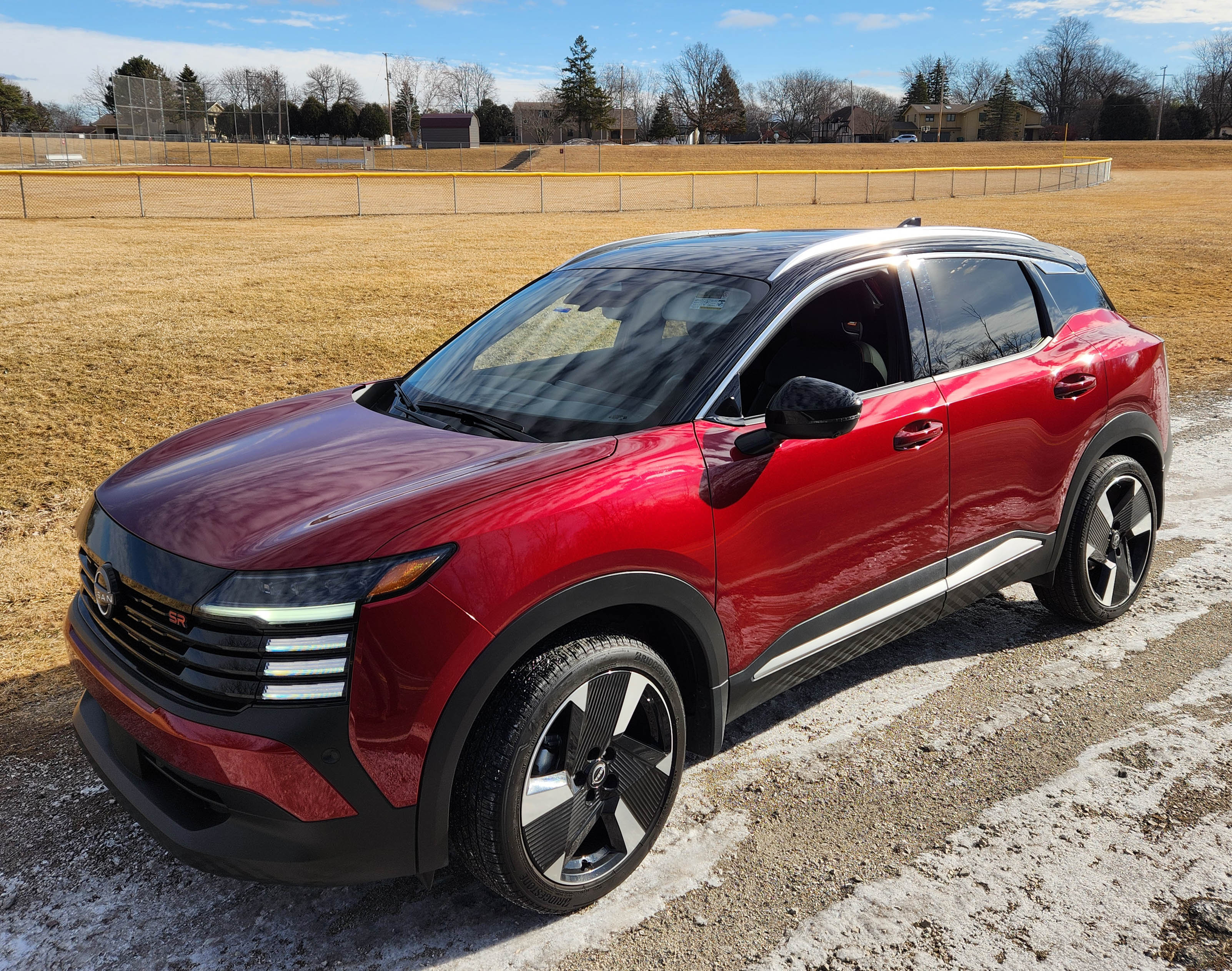 So Nissan restyles its small Kicks crossover for 2025 and this tested SR, top-level model, dons a bright metallic red paint job with black roof. That’s just $680 extra, a bargain price for paint these days when luxury makes are charging up to $5,000 just to have a NOT gray or white vehicle.