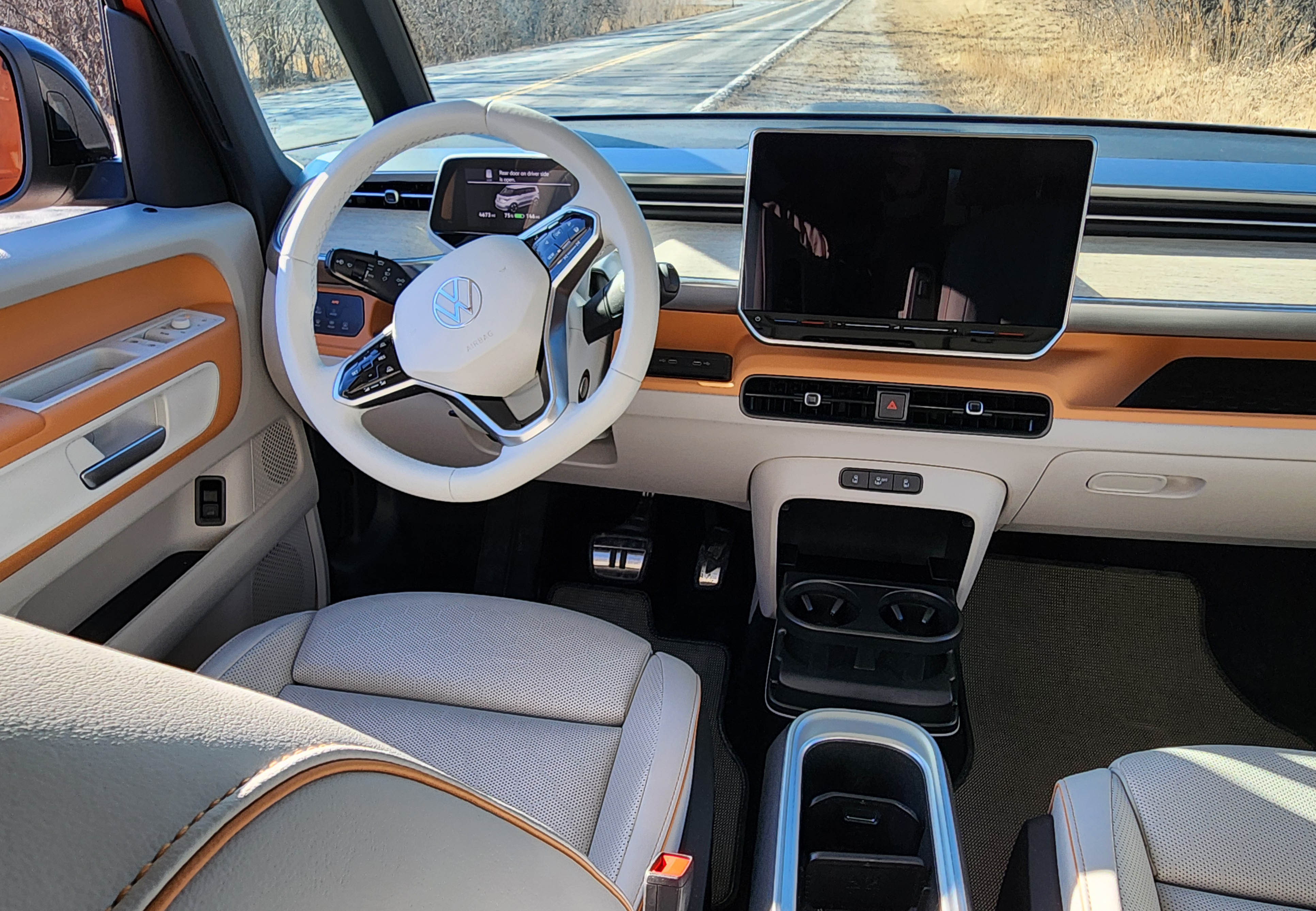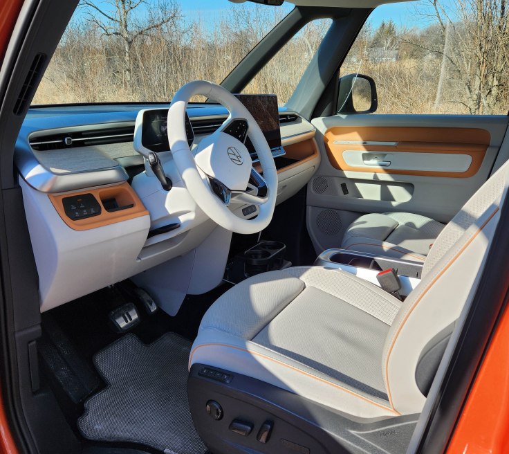 ID.Buzz’s styling with the stubby nose creates a large window space with big side-view vent windows that create excellent forward and sideways sightlines. That’s not common in any large SUVs these days as their massive A-pillars and thick mirrors often infringe on side views.