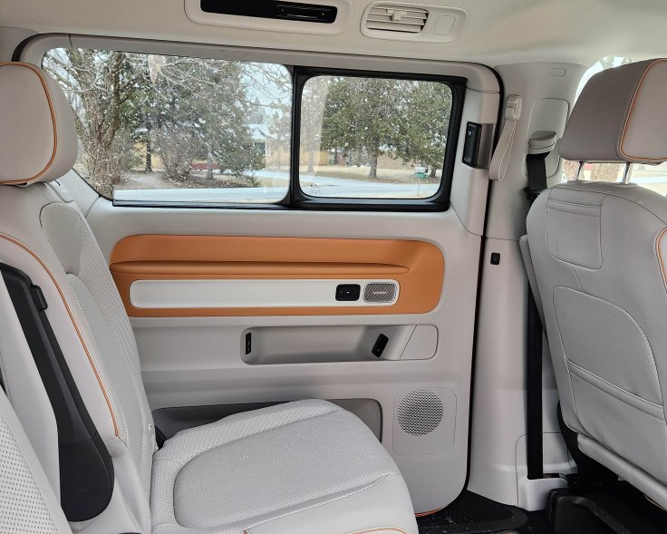 Hits: Fun retro looks inside and out, clean and strong electric power, roomy interior, plus AWD and power hatch. Seats are heated/cooled up front, plus massage, second row just heated but captain’s chairs, plenty of cord plug-ins, removable center console, big cupholders fold from under center stack’s big screen. Driver’s instrument pod easy to see as it moves with manual tilt/telescope wheel, sliding rear windows within windows, power sliding side doors, excellent front and side sightlines, drawers under rear cargo area tray for holding charge cable and groceries.