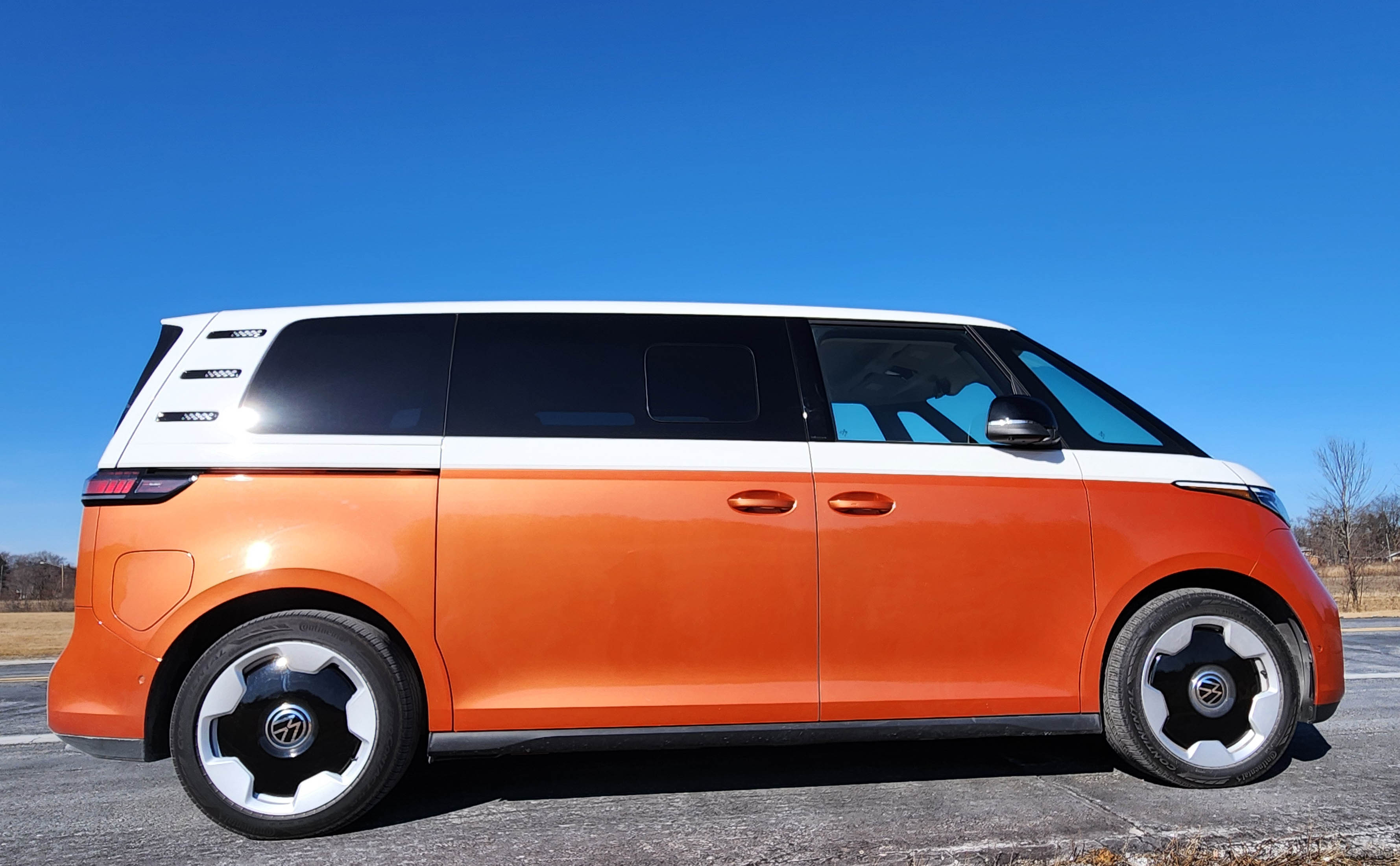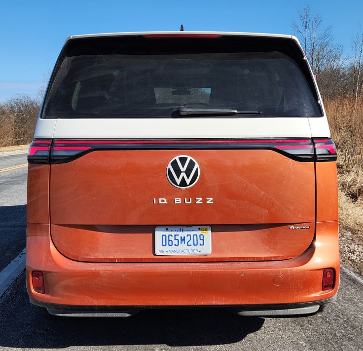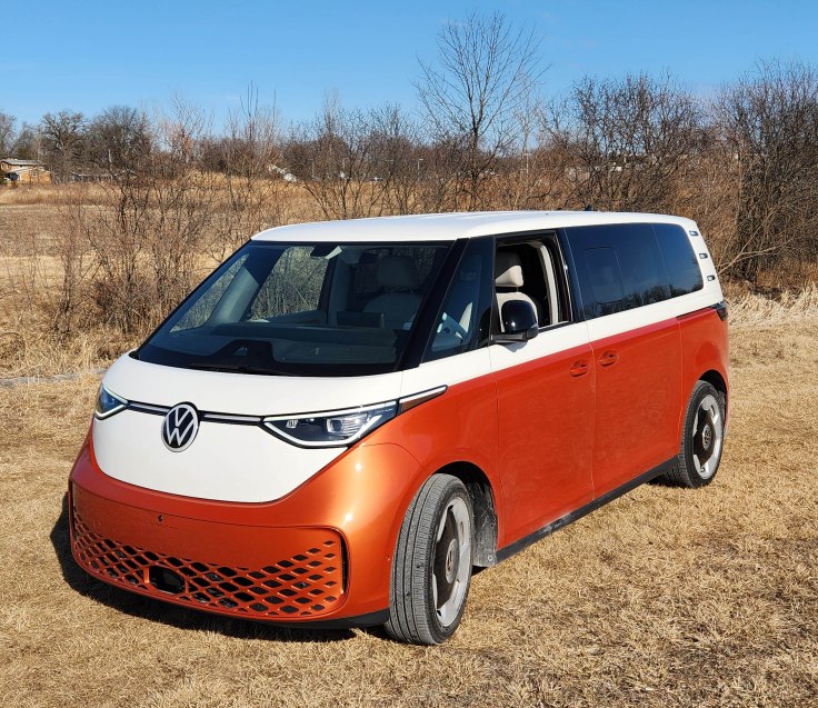 No, the new minivan is roughly an inch longer than the popular Toyota Sienna (testing it next week) and rides on a monster 131.1-inch wheelbase. That’s 11 inches longer than the Sienna’s wheelbase, and a full three feet longer than the original VW Bus’s wheelbase. That provides a huge platform for the batteries that power ID.Buzz and deliver a low center of gravity to help it feel well-grounded at nearly 6,200 pounds, about 1,500 more than a Sienna.