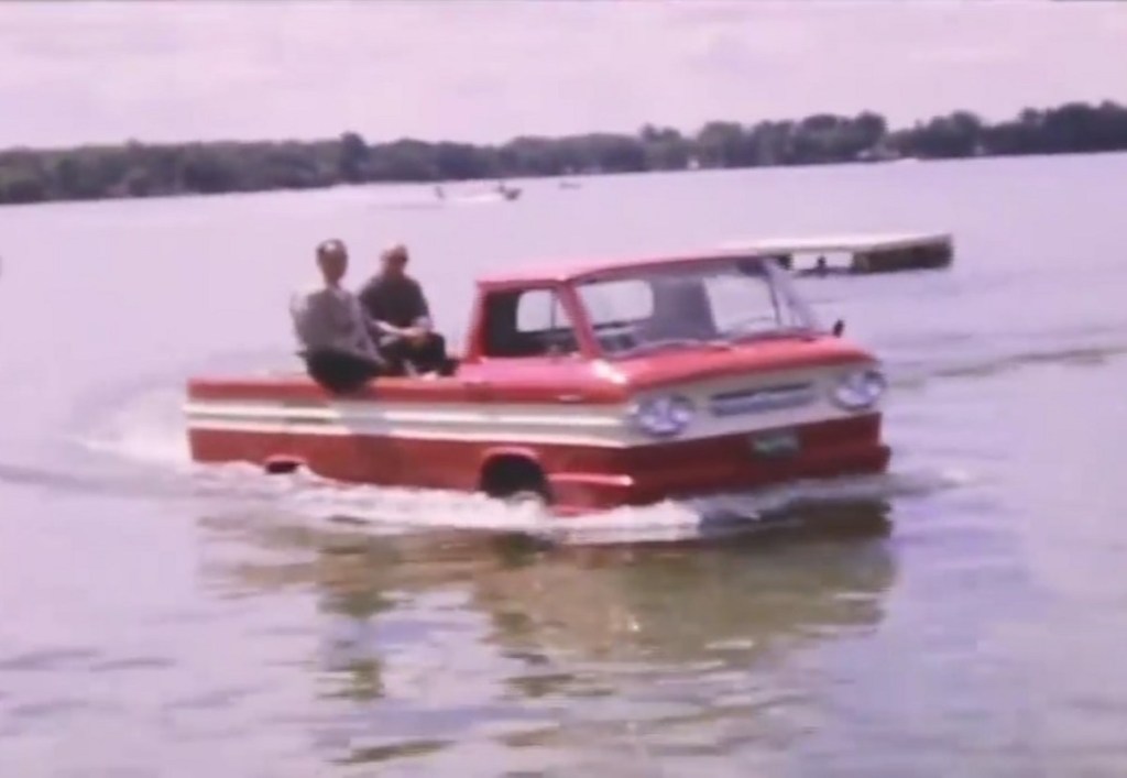 I love Corvairs. They were Chevy’s answer to the VW Bug when introduced in 1960. But they didn’t just make a car, they had a whole line of vehicles, including vans and pickups like the Rampside in this week’s spot. No, wait, it was not like the other Rampsides at all. Sure, it kind of looked like them, but this one could, like the Amphicar, become a boat. This is NOT an April Fool’s Joke!