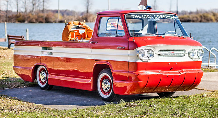 It is based on the Loadside Pickup modified with an extended bed and full fiberglass hull. The concept would allow users the opportunity to enjoy both terrestrial and aquatic travel, similar to the Amphicar Model 770 launched the same year. Most marine controls are located in the bed: Drive engagement, forward/reverse, and steering, while the throttle can be controlled from the cab or bed. Unlike the Amphicar, however, only one Corphibian was made. Hulten-Holm Co. hoped Chevrolet would purchase the design and put it into production, but this never happened.
