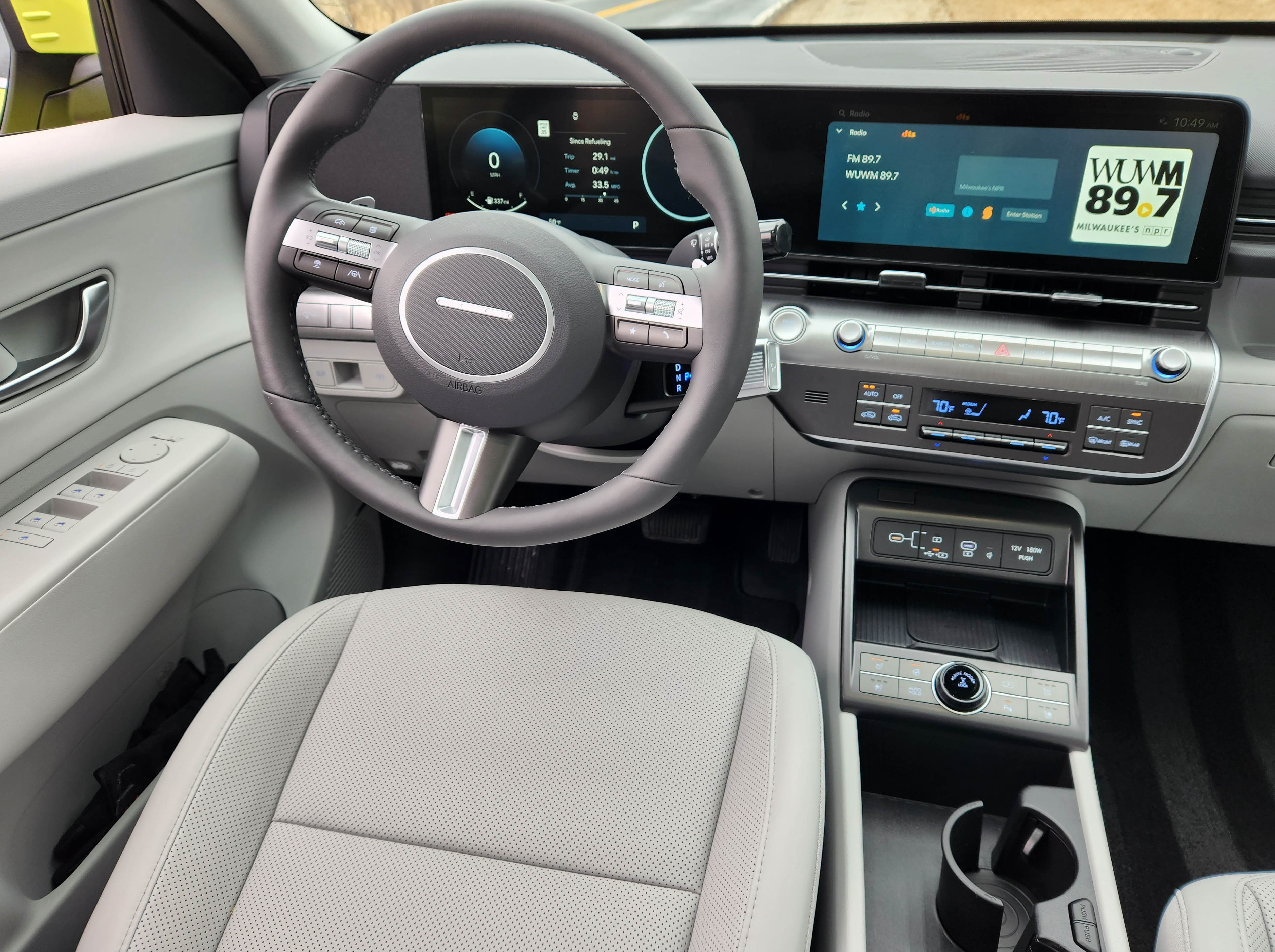 Inside, the tested Kona featured gray fake leather seats trimmed in cloth, with a matching gray soft-touch material used also on door panels. The upper dash is black with the lower portion gray, including a small shelf on the passenger’s side. There’s a handsome brushed chrome trim on the dash facing and under the wide one-piece dual info and instrument screens.