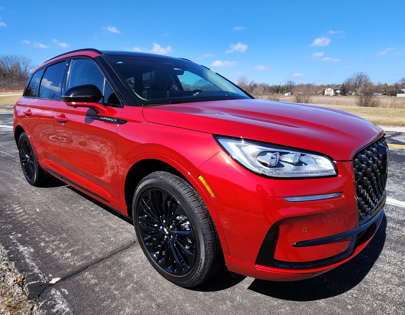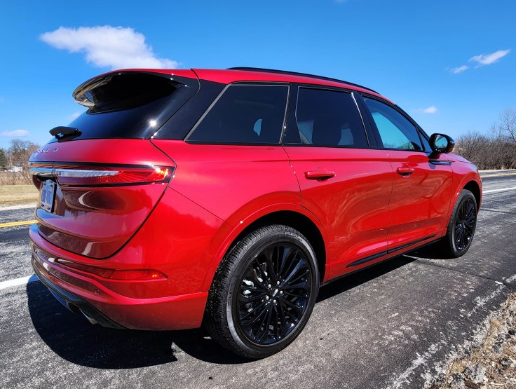 Corsair is a sharp looker too, especially the test ute smothered in what Lincoln calls Red Carpet Metallic paint ($750 extra), a bright sparkling red. Stance is more aggressive than an Escape with a swept back lower rear roofline. Optional 20-inch black aluminum wheels, part of the $2,250 Jet package, add to the sportier look. That package also includes some black exterior trim and body color bumpers.