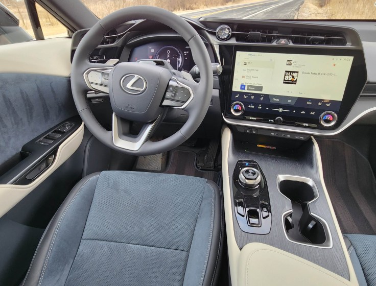 Well, its 71.4 kWh batteries simply don’t have the range of many others. While Lexus claims 220 miles of range and Car & Driver says to expect 196 miles of range with the 20-inch tire equipped AWD model tested, I got 146 (tops) with a full 100% charge. That was in Wisconsin during 30- to 45-degree weather and charged in a garage. Granted my garage isn’t heated, but still.
