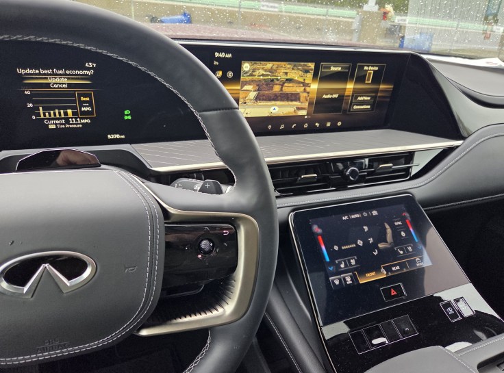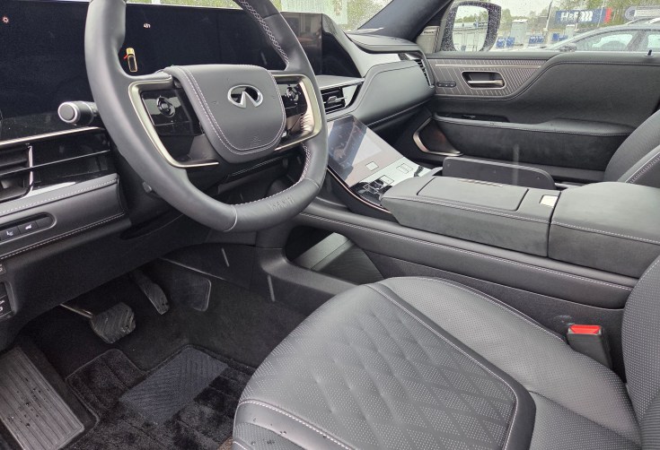 Standard though is a 24-speaker Klipsch premium stereo with some of the speakers wrapped around the front seat headrests. There are three big screens here too for info, and adjusting most needed functions, including a Tri-Zone Climate Control system with what Infiniti is calling Biometric Cooling. OK?