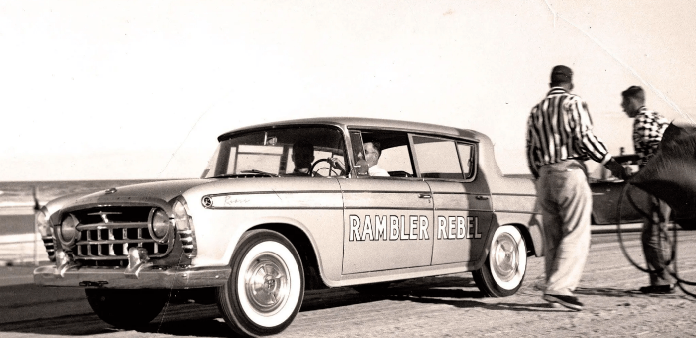 In the spring of 1957, the car known for its thrifty six-cylinder came to turn heads at Daytona on the beach, where it quickly proved to be the quickest production sedan at the Speed Trials being held there. In this example was its brand new 327 cubic inch V8 producing 255 hp at 4,700 rpm and a whopping 345 lb-ft of torque at just 2,600 rpm. Originally intended for the larger Nash and Hudsons propelled the fairly light Rambler, a four-door sedan, from 0-60 in 7.5 seconds and through the 1/4 mile in 18.32 seconds. Wow, a Rambler! That was seriously fast in 1957, and the quickest 0-60 time of any sedan at the event, thanks to its new engine.