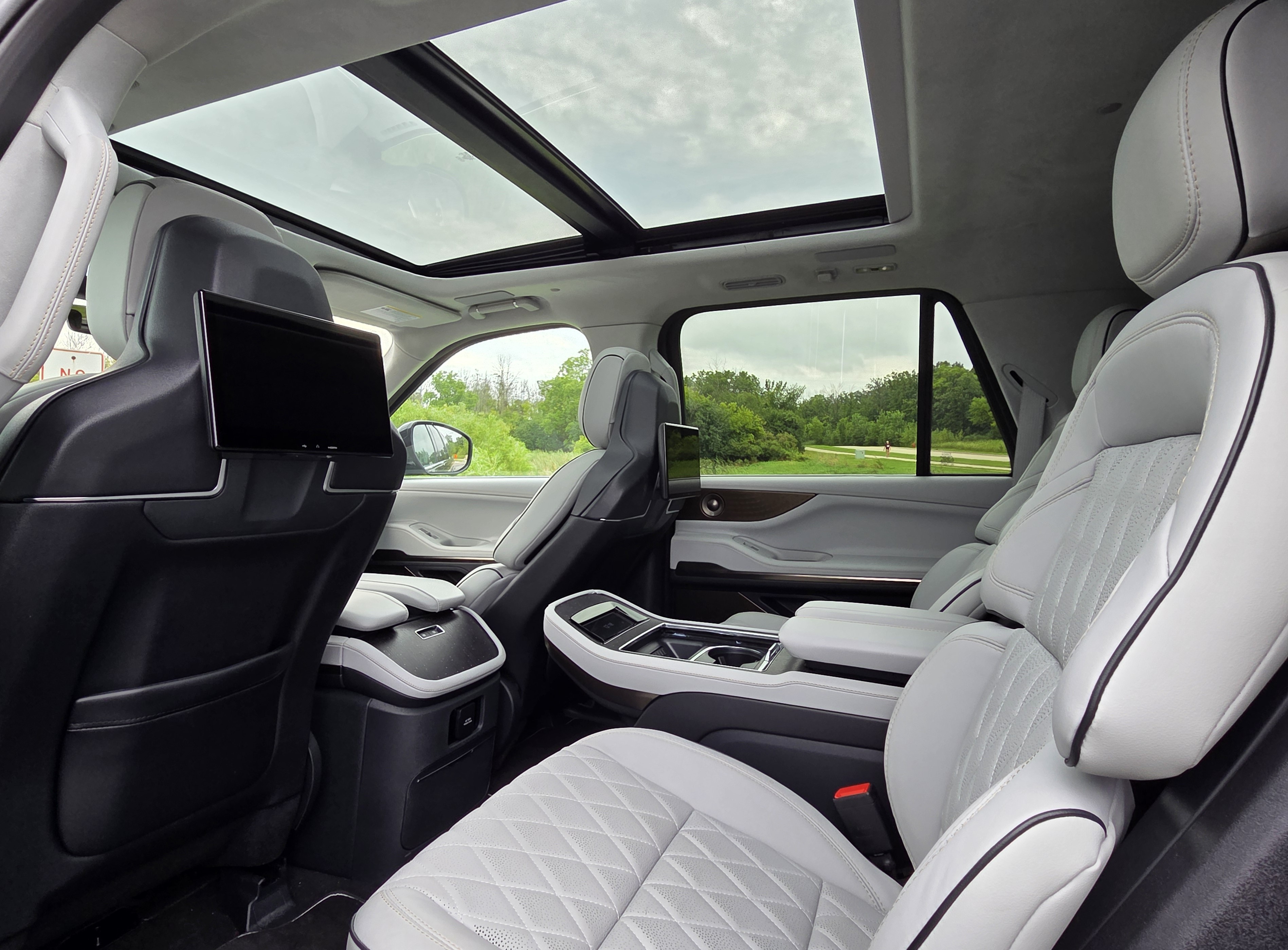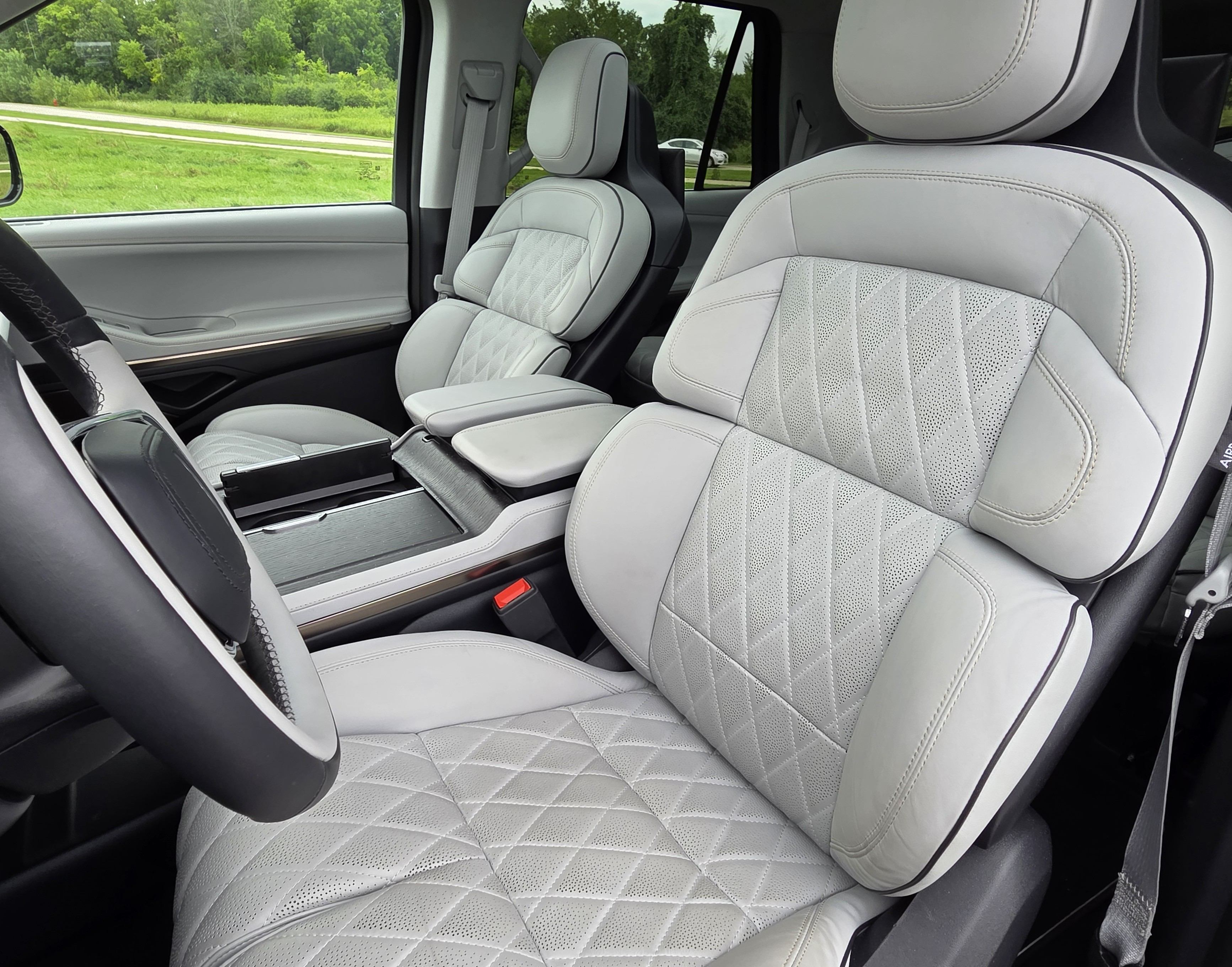 Seats in the Chroma Caviar Dark Gray Metallic Navigator were a supple gray quilted leather with more leather padding on the door panels and a matte black dash top that quashes dash reflections on sunny days.