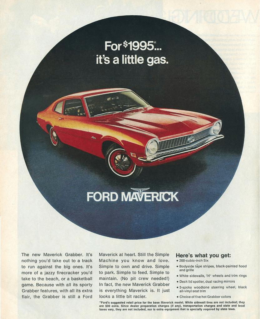 Introduced on April 17, 1969, as a 1970 model at just $1,995 ($19,151 in 2025 dollars). The TV commercials used the same music as the other Ford ads in the 1969 model year campaign, “Ford, it’s the going thing.” It replaced the Falcon and was available with inline-six engines or the more desirable 302 cubic-inch (5.0L) V8. Offered as both a two-door sedan and, for the first time in 1971, a four-door sedan. The 1971 model year brought the introduction of the Grabber, a sportier version with dual hood scoops and bold graphics. Inside, the low price point showed as much of it was made up of cheap plastics, and the early one didn’t even have a glove box. The Maverick’s styling featured the long hood, fastback roof, and short deck popularized by the Mustang, on a 103-inch wheelbase.