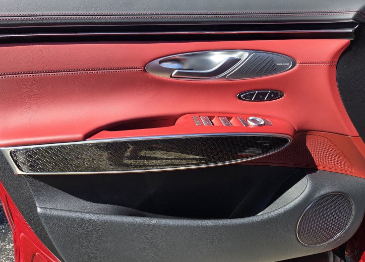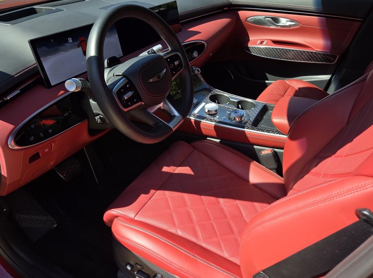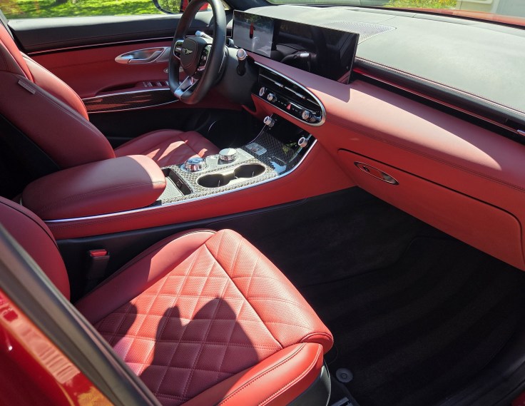 Styling remains consistent inside with oval door control panels and an oval dash gauge surround. Seats are quilted dark red Nappa leather, and door panels feature black leather over the red leather panels below. GV70’s dash is black leather mostly with red stitching and the trim is a diamond-patterned carbon fiber on the console and doors, which looks pretty spectacular on a sunny day.