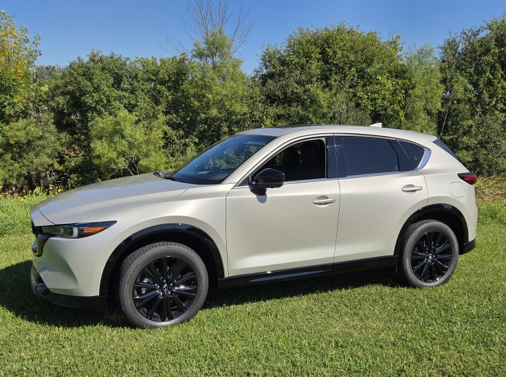 The tested near top-end CX-5 2.5 Turbo Premium was bathed in what it calls Platinum Quartz Metallic, a sparkling champagne, sort of between cream and tan, although it can look grayish at times too.
