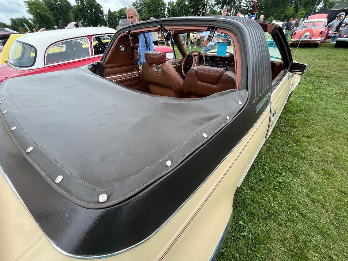 Close-up view of a 1981 AMC Sundancer Targa convertible, showcasing its brown vinyl roof and interior details at a car show.