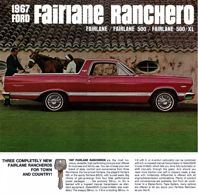 Two years later Ford decided to transfer the model to the all-new Falcon platform. Available as a stripped Ranchero and fancier Custom Ranchero, the new ute was a hit. It was available with one of two inline-sixes, 170 and 200ci and two versions of the 289 V8 for early on. In 67, it was transferred to the Fairlane. Riding on a 113-inch wheelbase, the base engine was the 200, but a more fun option was the big-block 390 with up to 315 horsepower. All remnants of the Falcon were now gone. Fairlane styling included contemporary vertical headlights that tied in better with Ford’s full-size series and came off as being more upscale than the Falcon’s. And bingo, just like that, Ranchero sales jumped from only 9,480 in 1966 to 17,293 in 1967.