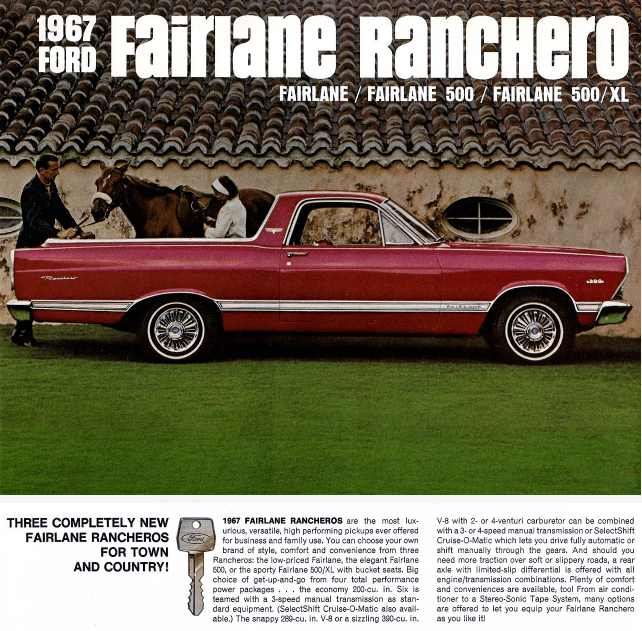 The automotive press at the time loved this car, er truck, er ute. A road test article that appeared in Car Life magazine said, “The 1967 Ford Fairlane Ranchero combines car-like comfort with pickup utility, appealing to both men and women. It is recommended for those needing a vehicle for light-duty tasks rather than heavy hauling, with a focus on aesthetics and comfort.” The Ranchero was produced off and on until 1979, with a total of 508,355 units produced. Sales numbers by year were all over the board, peaking in the early 70s with over 40,000 units in 1972 and 45,741 in 1973.