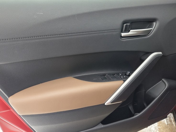 This red crossover featured a black and brown interior with fake leather brown seats and door arm rests. The dash and door tops were a textured black material and the console top a matte black to avoid reflections. Door and dash trim is matte silver.