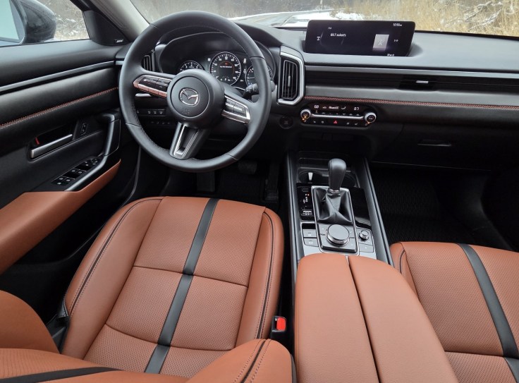 Acceleration is plenty strong as it is in Normal mode, but a console-mounted toggle allows a quick tap into Sport that’ll boost the Mazda’s launch. There also are Tow and Off-Road modes.