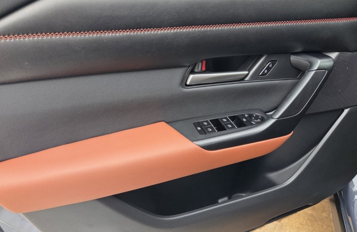 The other off-road extras are visuals, including a matte black hood with CX-50 graphics, black grille and headlight/rocker panel garnishes, black emblems and roof rails, and then a sharply decorated interior with terracotta colored leather trimmed seats with a black accent racing stripe, unique terracotta stitching in the black door trim along with heated rear seats and a heated steering wheel, which should be a flat-bottom, but is not.