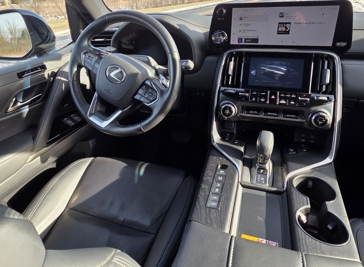 Trailering adjustments are on the dash’s lower left, along with an inside fuel door release. The big LX 700h will tow up to 8,000 pounds.