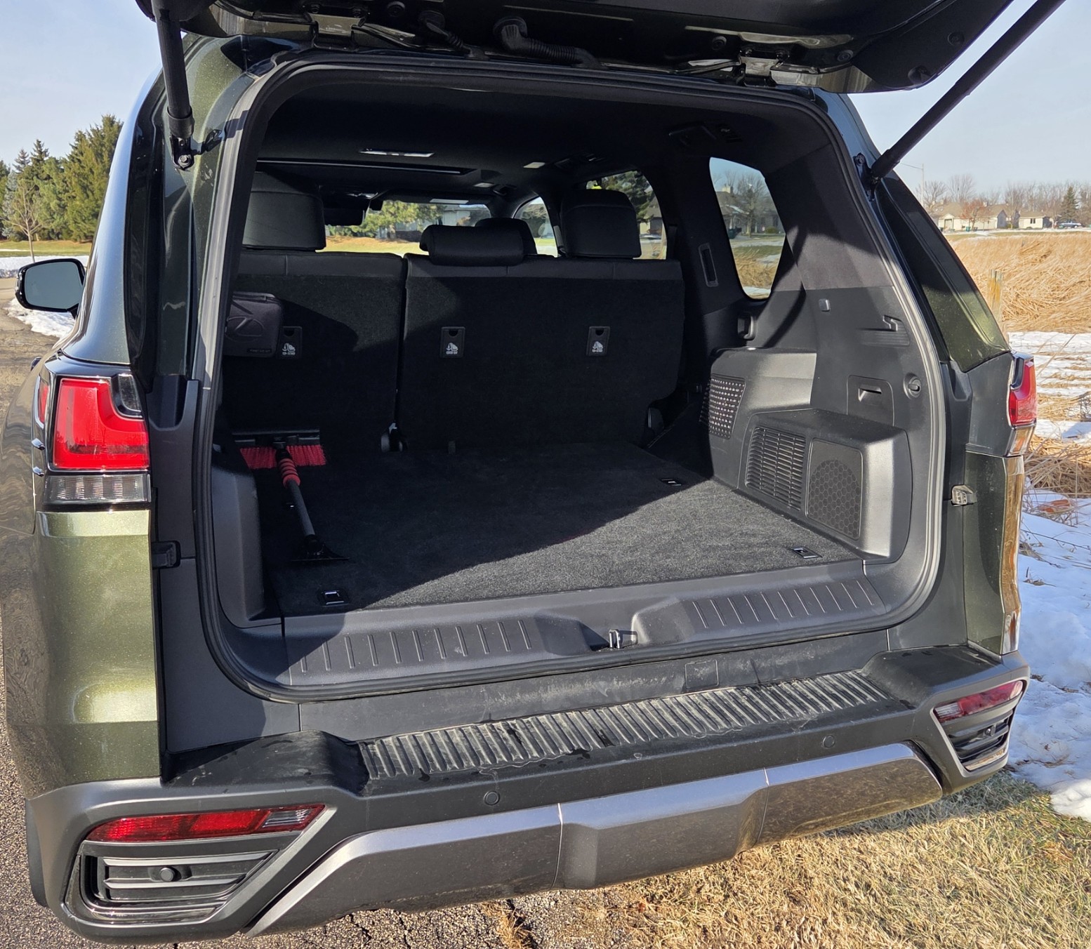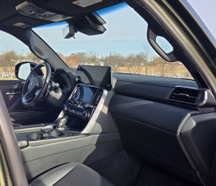 While this layout eliminates seating for two extra folks it creates a much more accommodating cargo area. However it does shrink some here compared with the gas-only LX 600 due to the hybrid system’s equipment. Experience tells us that with a third-row seat there is precious little cargo space behind that back row, meaning you’ll likely fold it down most of the time, unless requiring seats for seven.