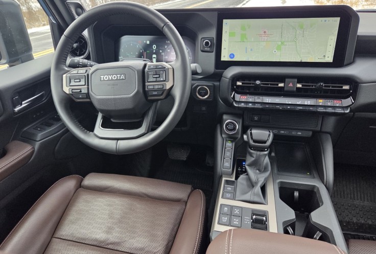 Inside, the Land Cruiser looks and feels modern, just more plain than the Lexus with brown fake leather seats and door arm rests with tan stitching. Dash and doors are black with some soft material at the bottom and midway up. Tops are harder black plastic. Both the door control panels and console top are a matte finish that avoids glare. Dash air vents are black with a tiny bit of chrome trim.