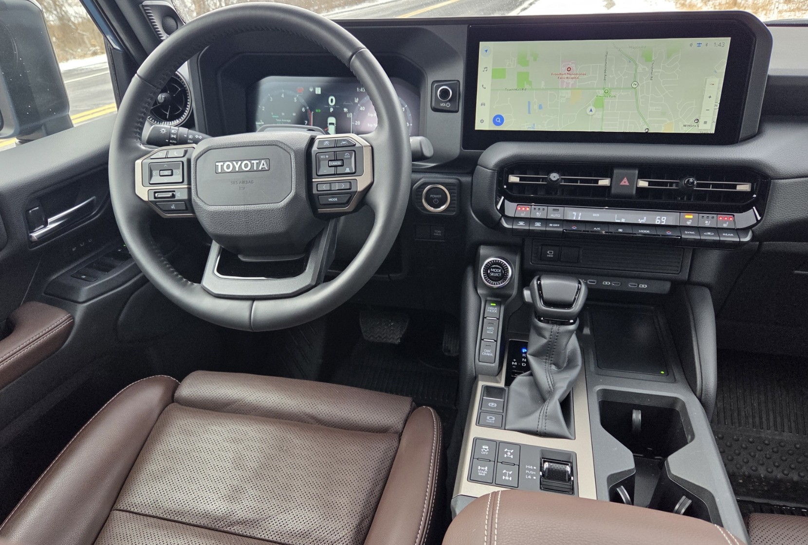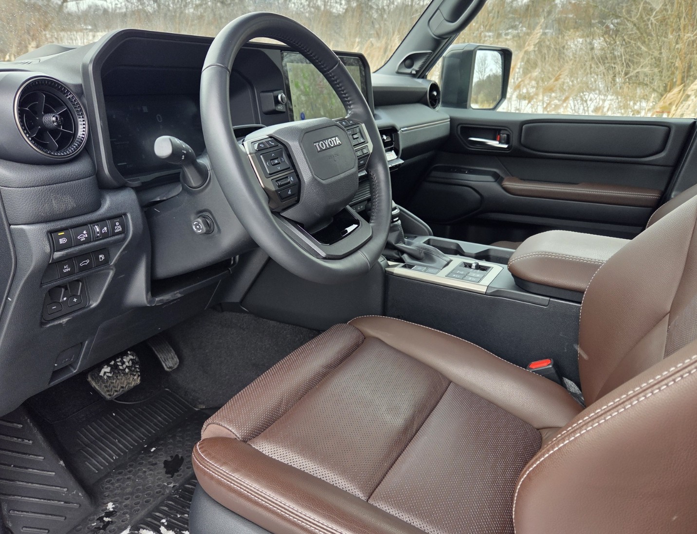 Toyota wraps the power tilt/telescope steering wheel in black leather and the entire wheel is heated. No fancy wood trim anywhere here as in the Lexus.