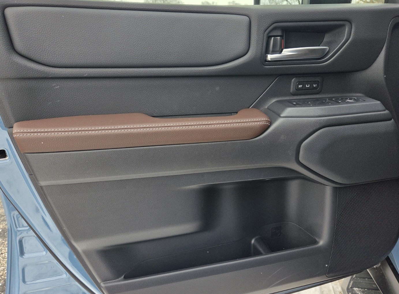 Inside, the Land Cruiser looks and feels modern, just more plain than the Lexus with brown fake leather seats and door arm rests with tan stitching. Dash and doors are black with some soft material at the bottom and midway up. Tops are harder black plastic. Both the door control panels and console top are a matte finish that avoids glare. Dash air vents are black with a tiny bit of chrome trim.