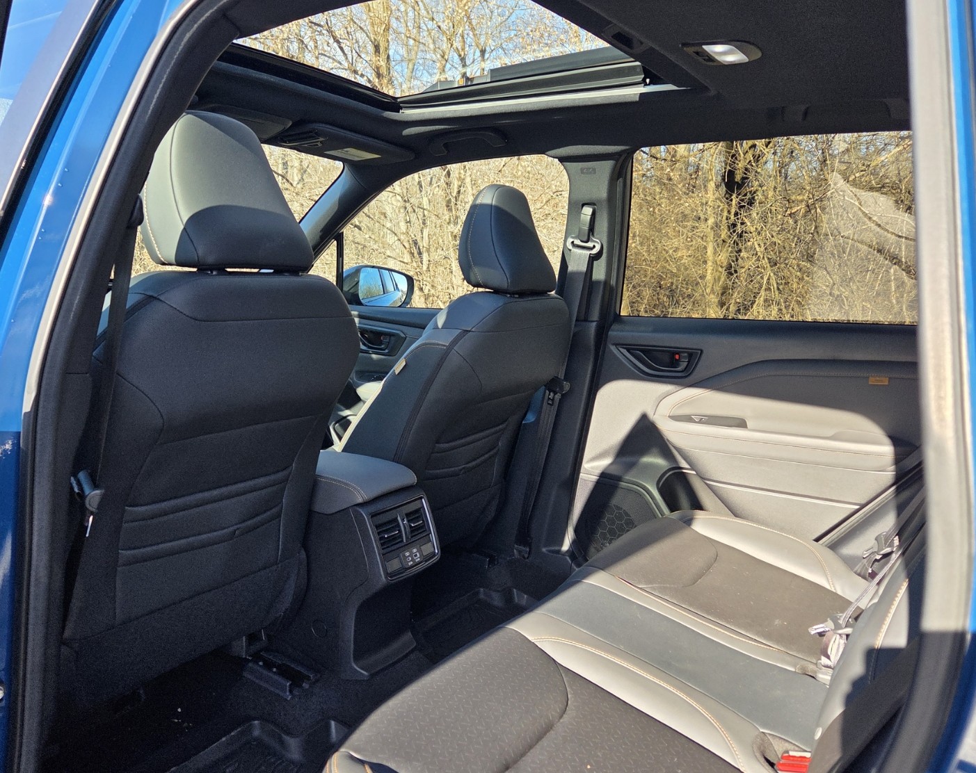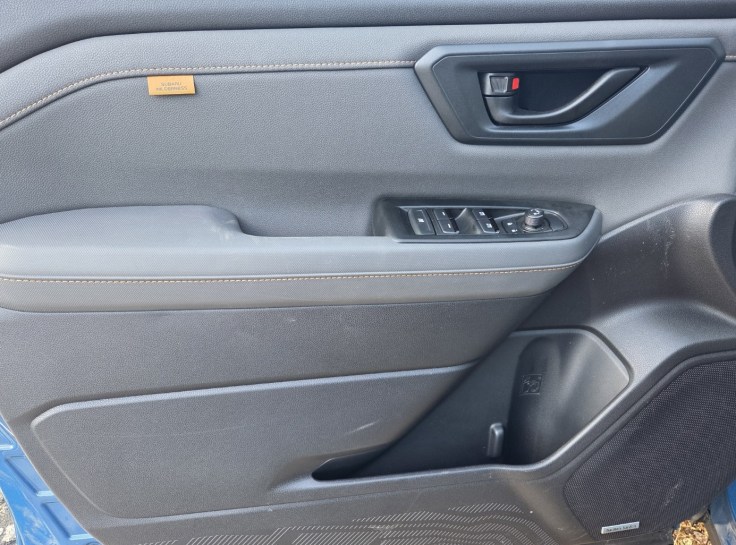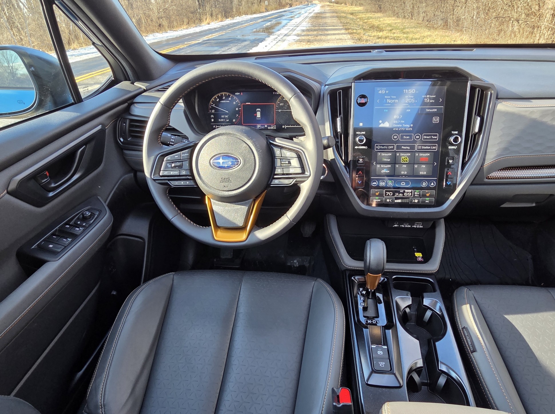 Inside, this dark blue Forester Wilderness spiffed things up with black StarTex fake leather upholstery featuring copper stitching and Wilderness logos on the headrests. The copper stitching matches the anodized copper accents gracing the exterior to signify this is an upscale Forester. Key though is the seats are quite supportive with a power driver’s seat and lumbar support. Front passenger’s seat is manual.