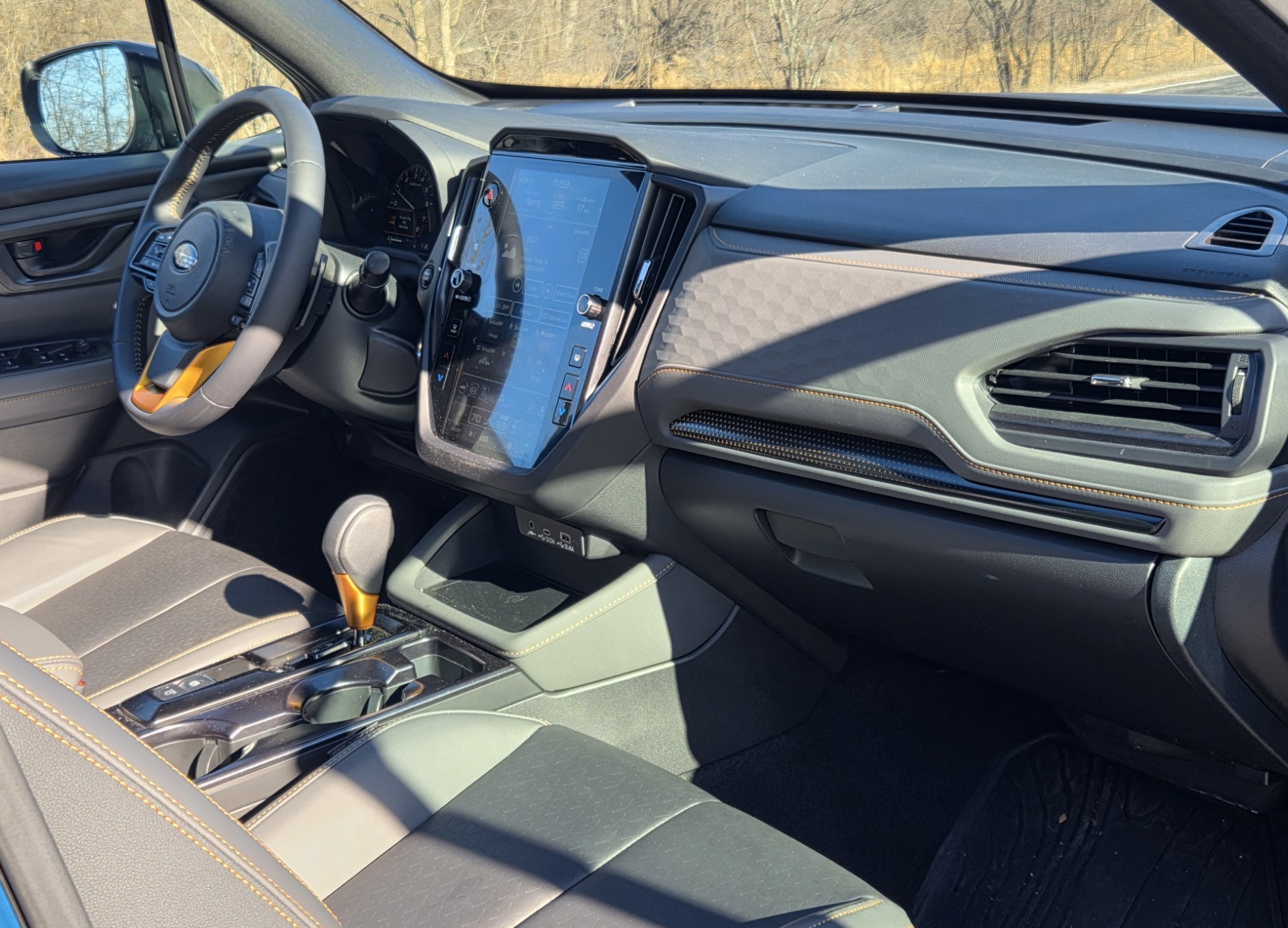 On the brighter side, there’s a wireless phone charger and a big sunroof. Wilderness trim also includes copper accents on the steering wheel and console-mounted shift knob, plus copper stitching trim on door panels and dash.