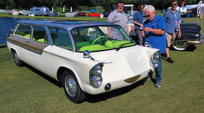 Larson re-christened the car “Futura” after the early ’60s Ford Falcon Futura. It bears the Futura’s wheel covers and script. Power comes from a Corvair, air-cooled, 145 cu. in. flat-six engine, 84 hp in the rear, mated to a two-speed Powerglide automatic.
