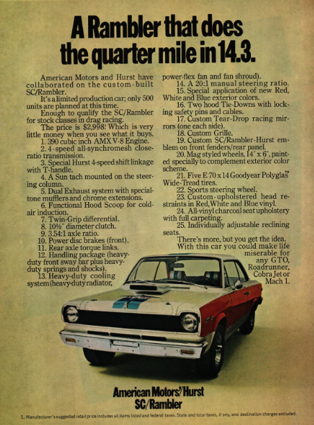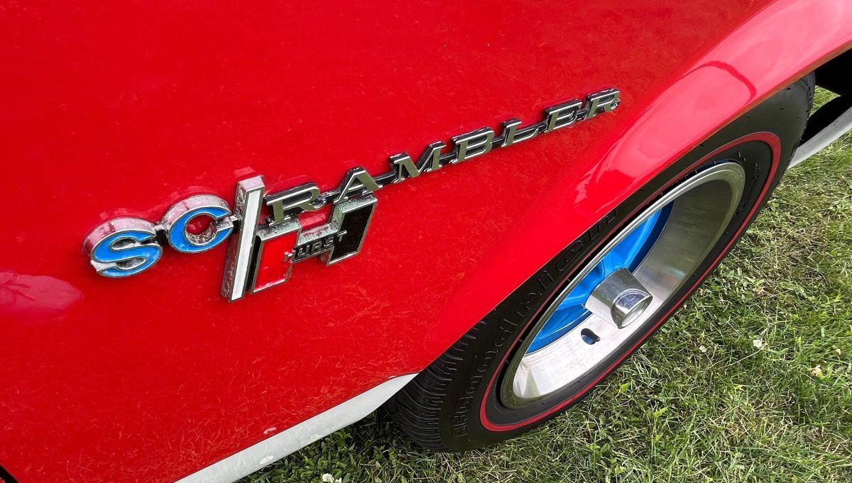 All SC/Ramblers started as white hardtops with two-tone mags, racing mirrors, blackout grille and tail panel, Hurst badging, and a real ram-air hood scoop. There were two options on the exterior, An A and a B. The A came with broad red bodysides, wild hood graphics, and a fat blue dorsal stripe, while the B made do with only simple rocker-panel striping. All this for a base price of, wait for it, just $2,998.